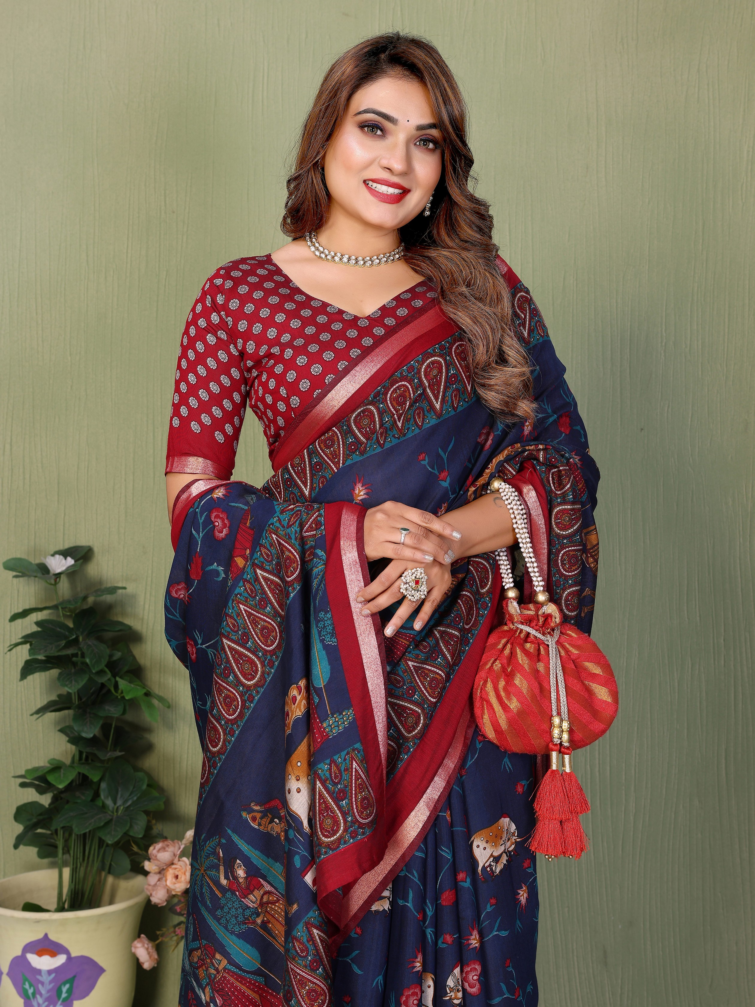 Teal Color Mul Cotton Designer Kalamkari Printed Ethnic Partywear Saree
