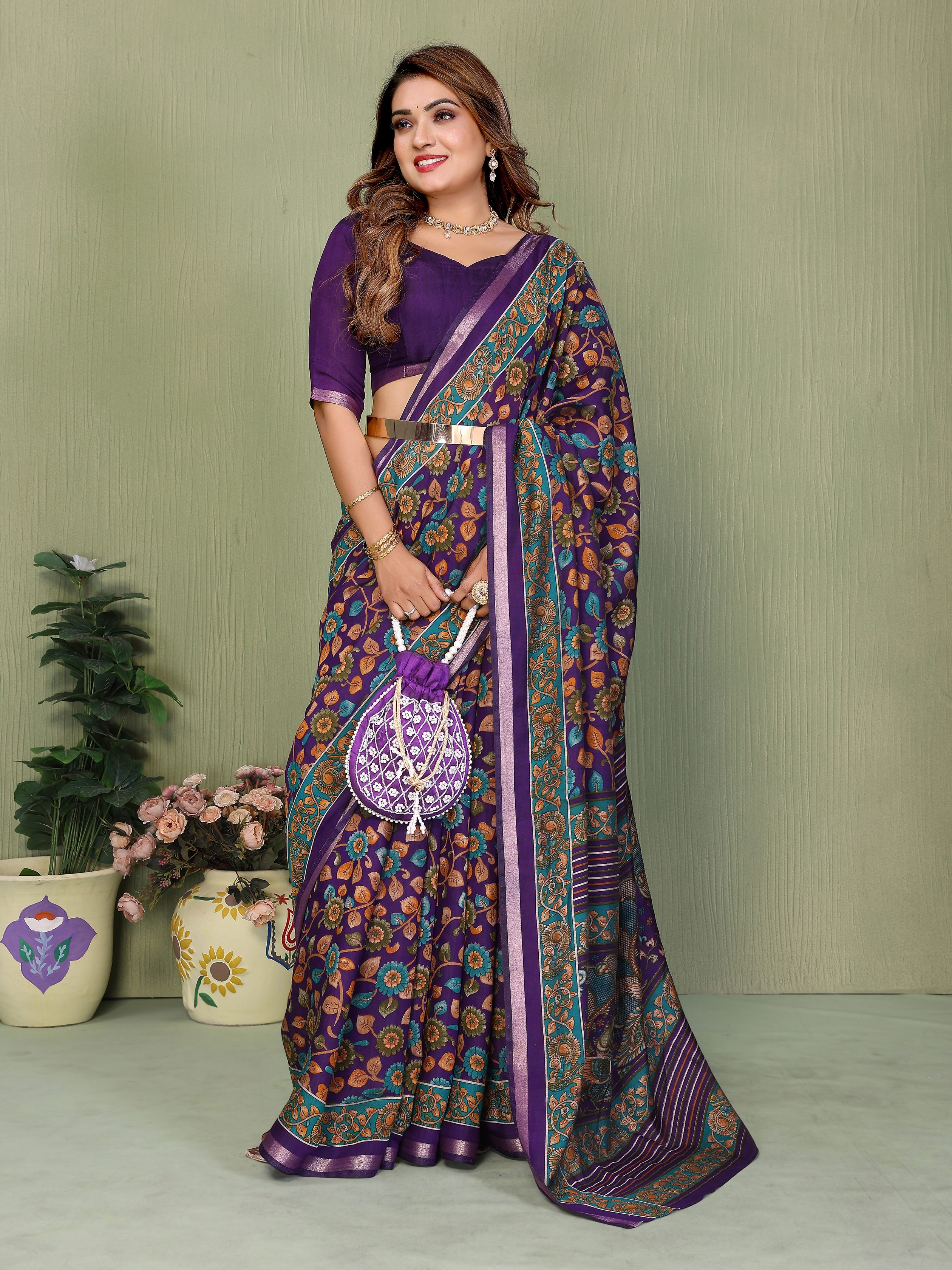 Violet Color Mul Cotton Fabric Designer Printed Partywear Saree