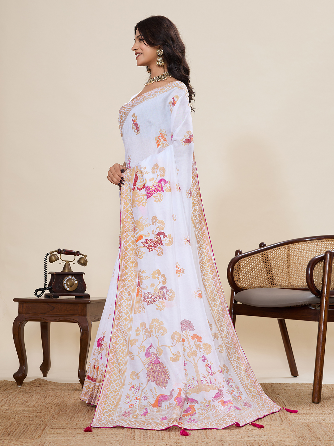 White Color Blended Cotton Fabric Designer Table Printed Saree