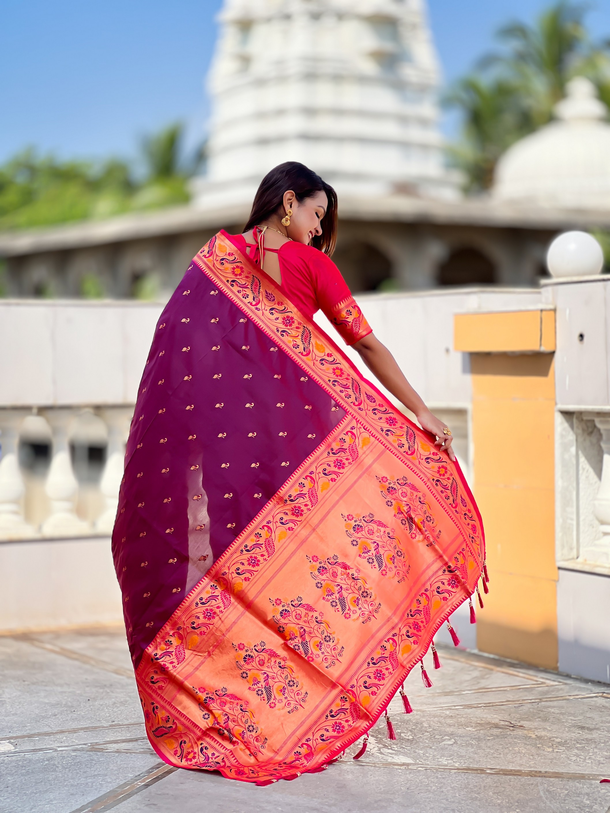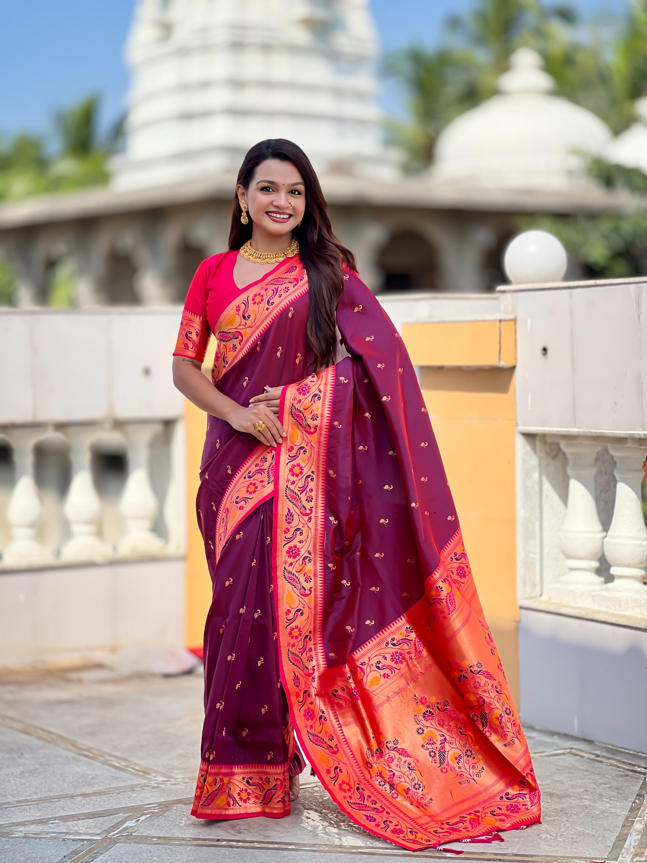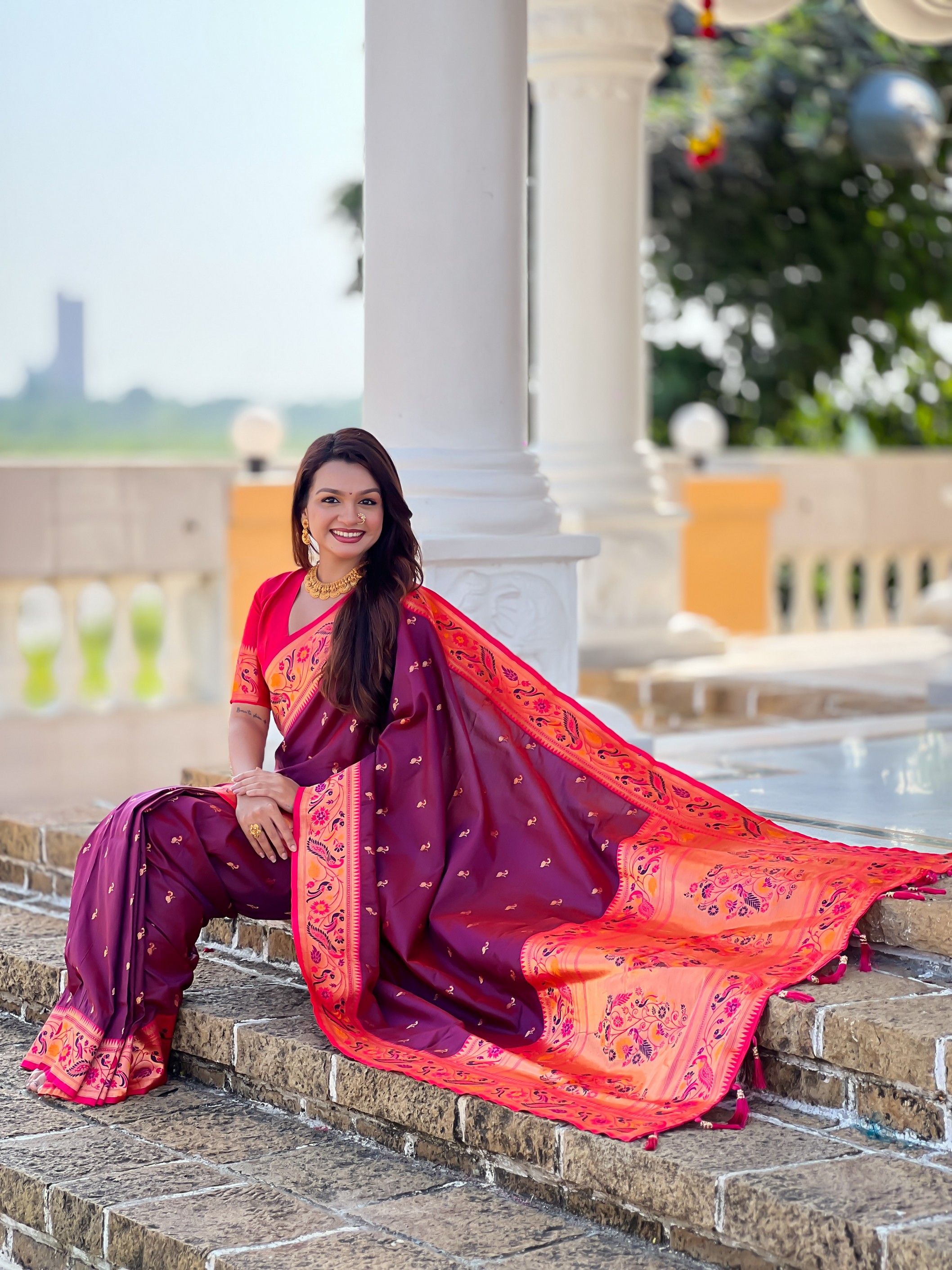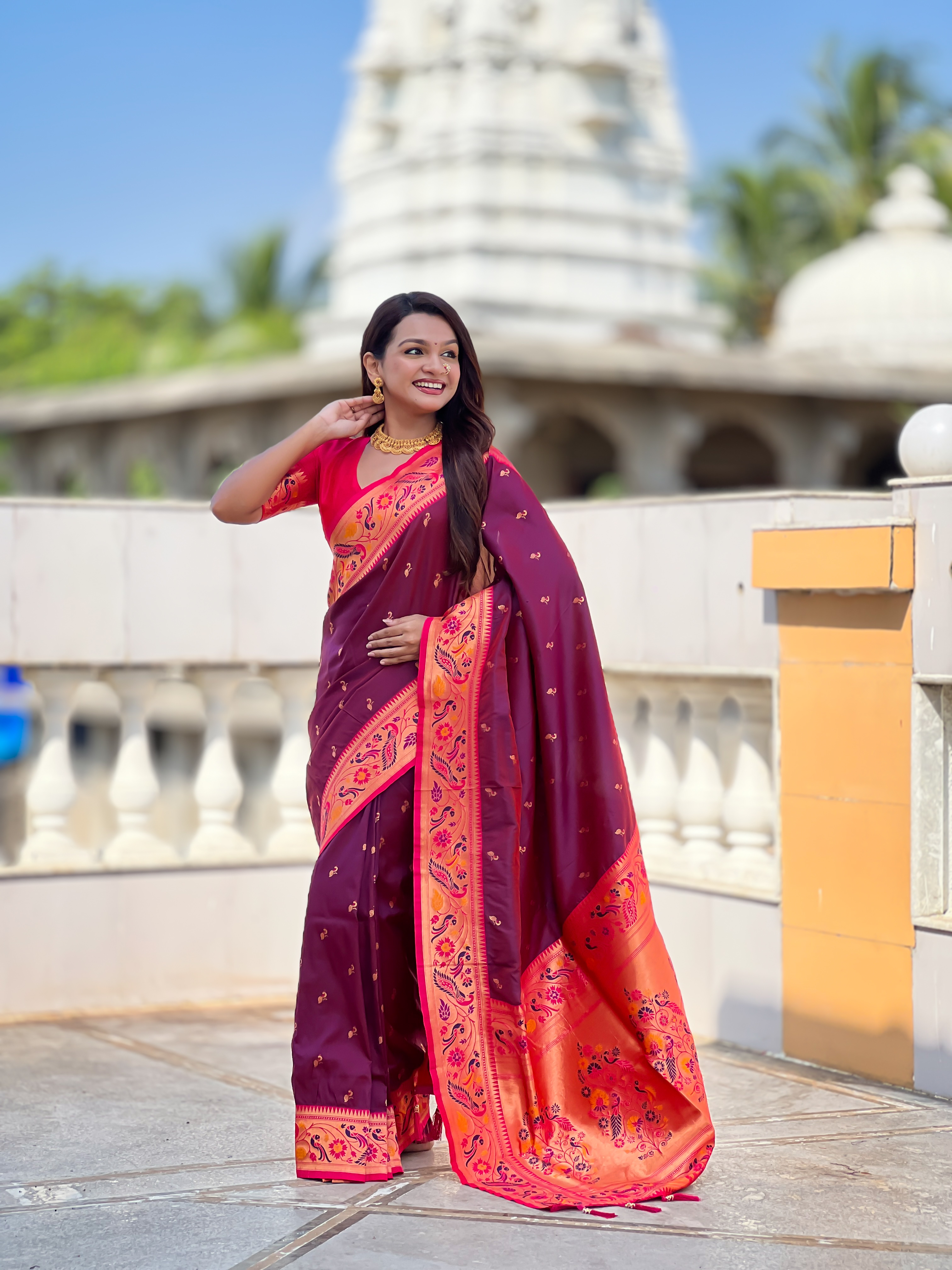 Wine Color Paithani Silk Fabric Woven Meenakari Jacquard Designer Saree