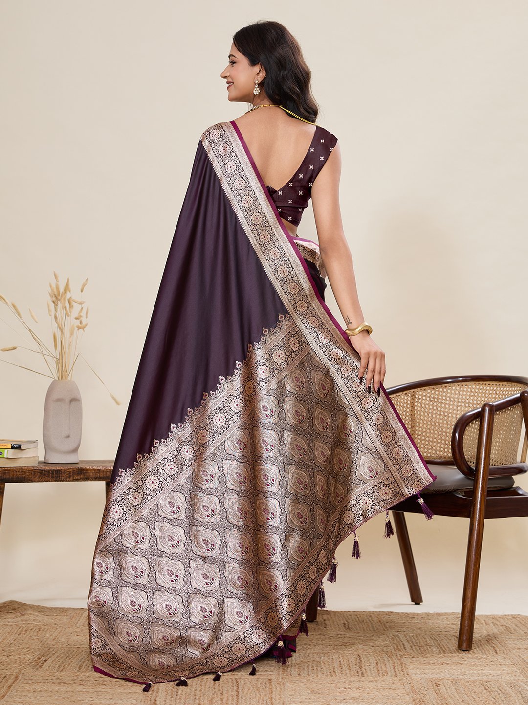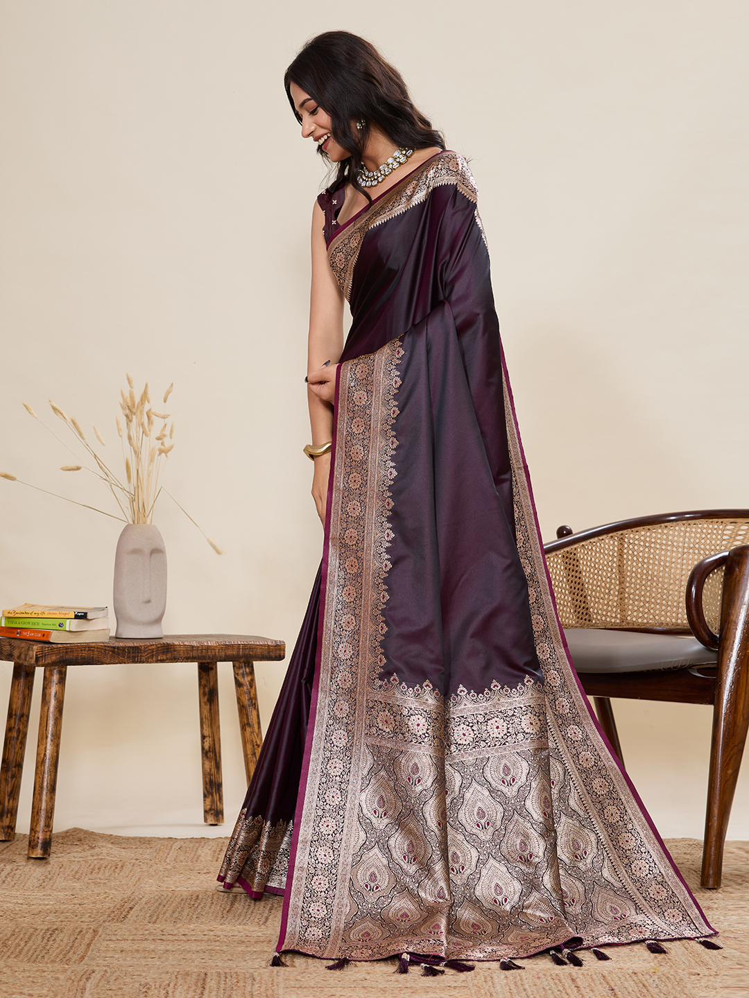 Wine Color Satin Silk Fabric Wevon Jari Designer Graceful Partywear Saree