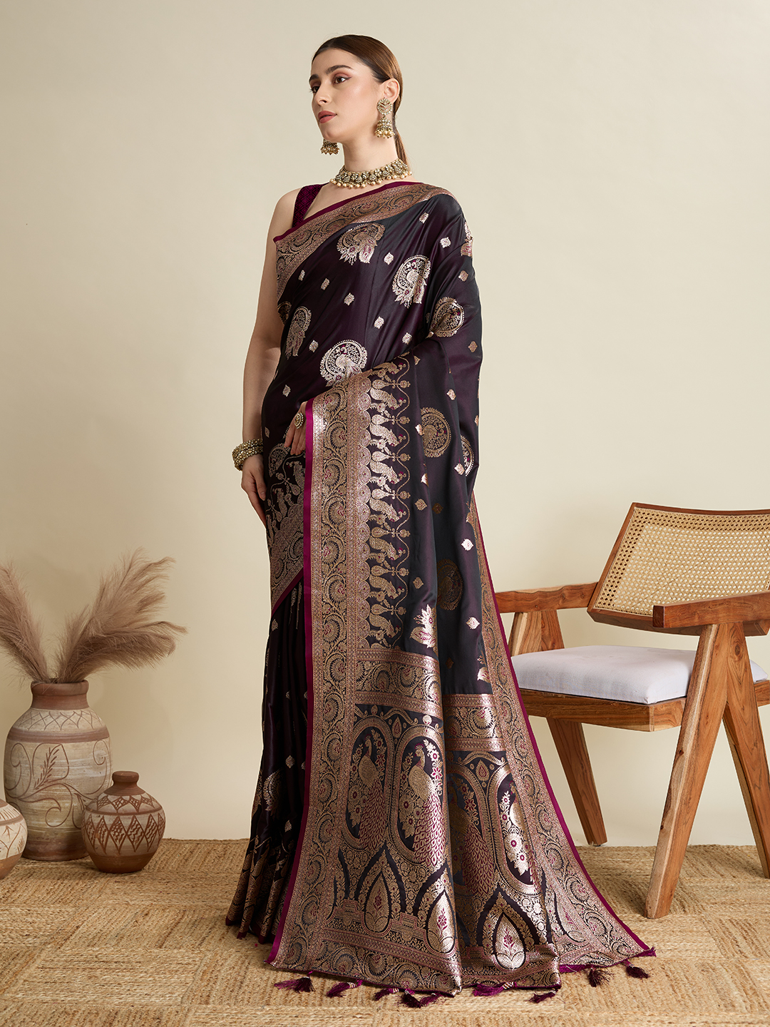 Wine Color Satin Silk Wevon Jari Designer Trendy Festive Saree