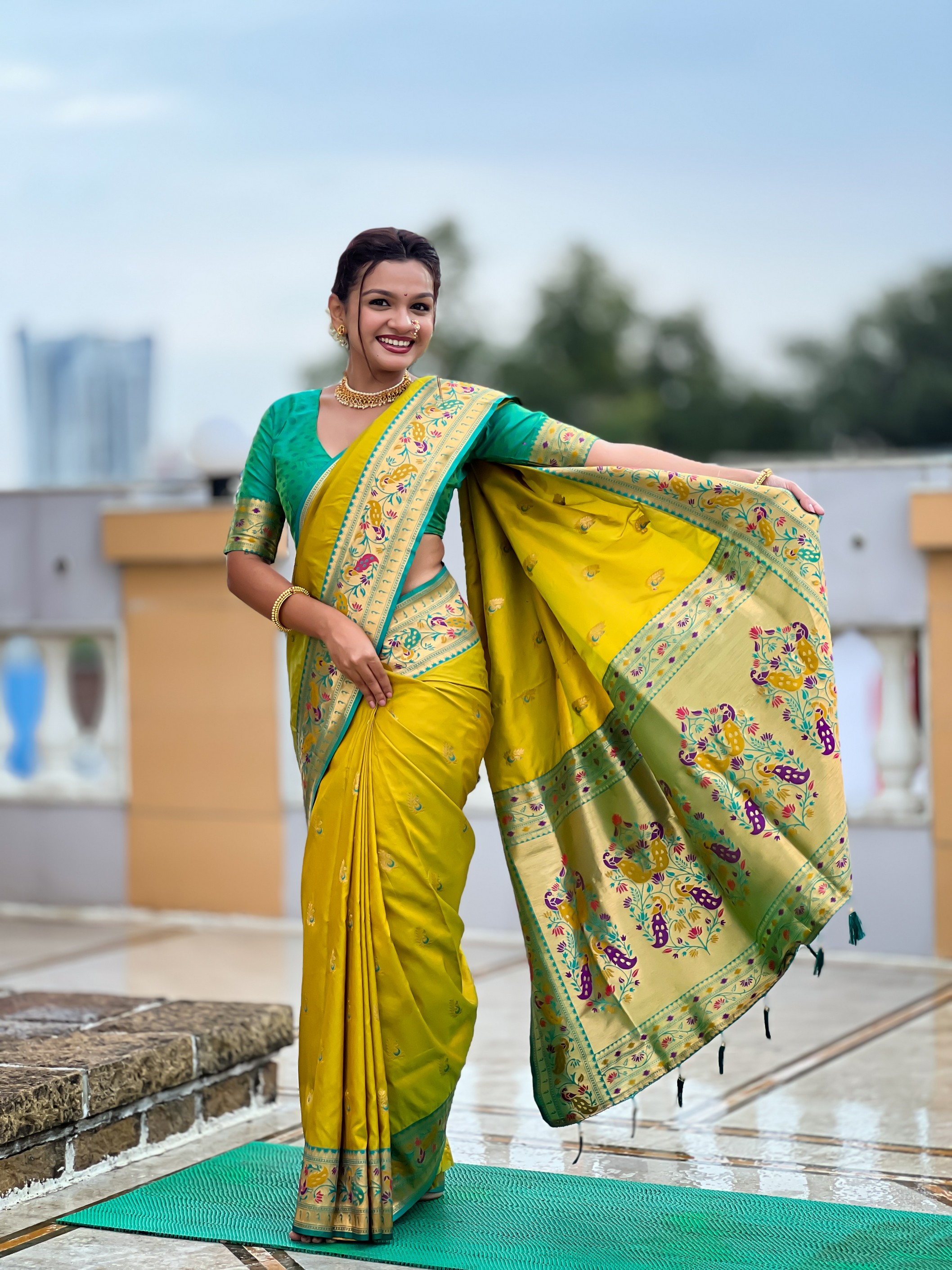 Woven Meenakari Jacquard Designer Parrot Green Color Paithani Silk Saree