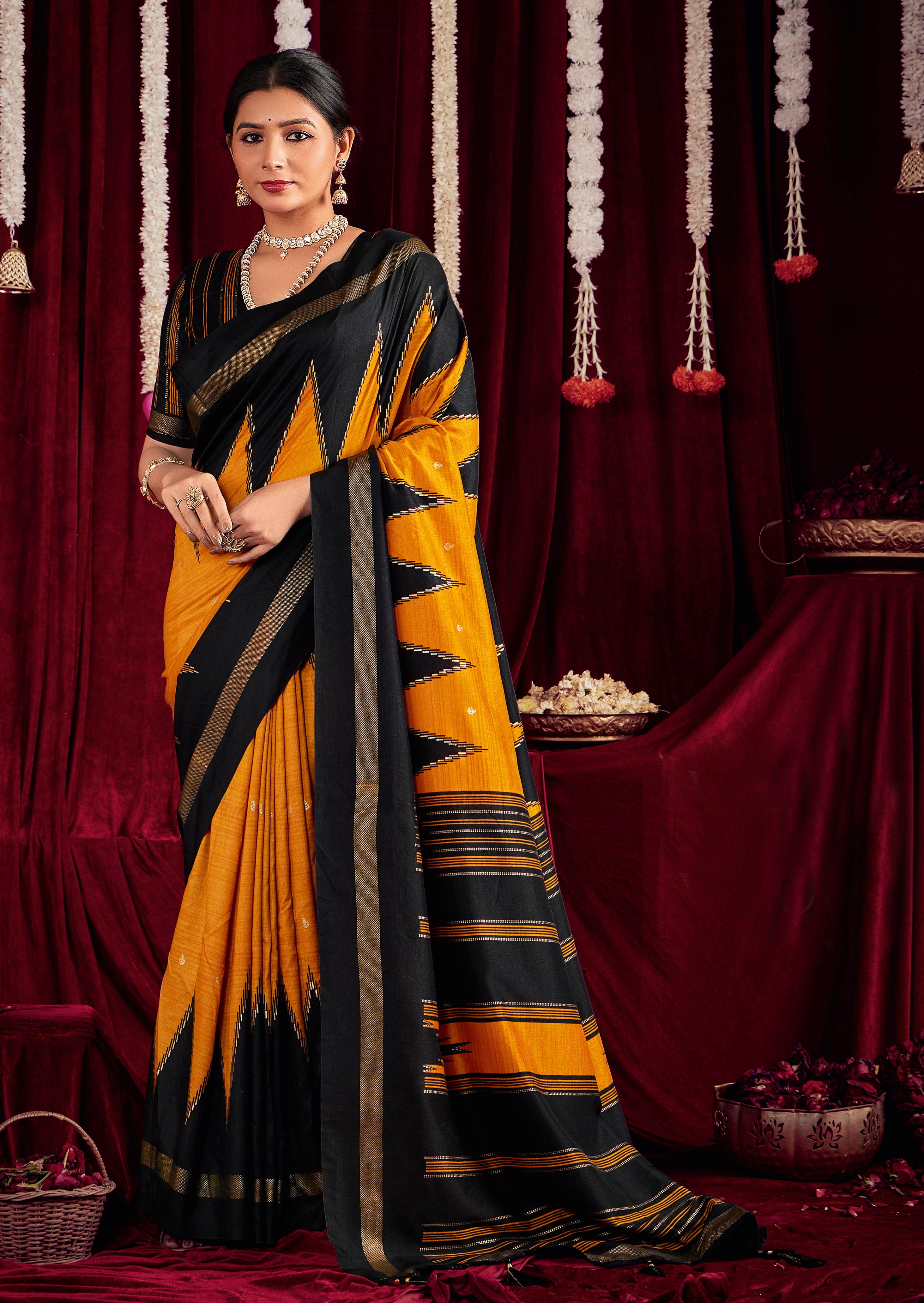 Yellow & Black Color Ikkat Silk Fabric Designer Zig Zag Printed Traditional Party Looks Saree