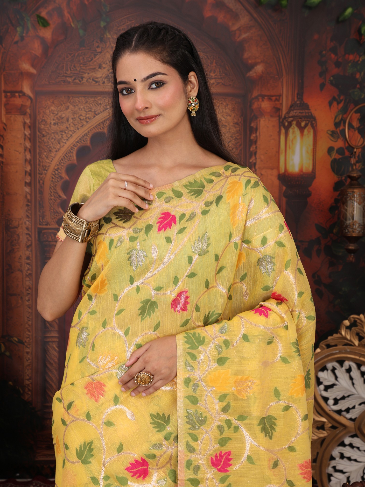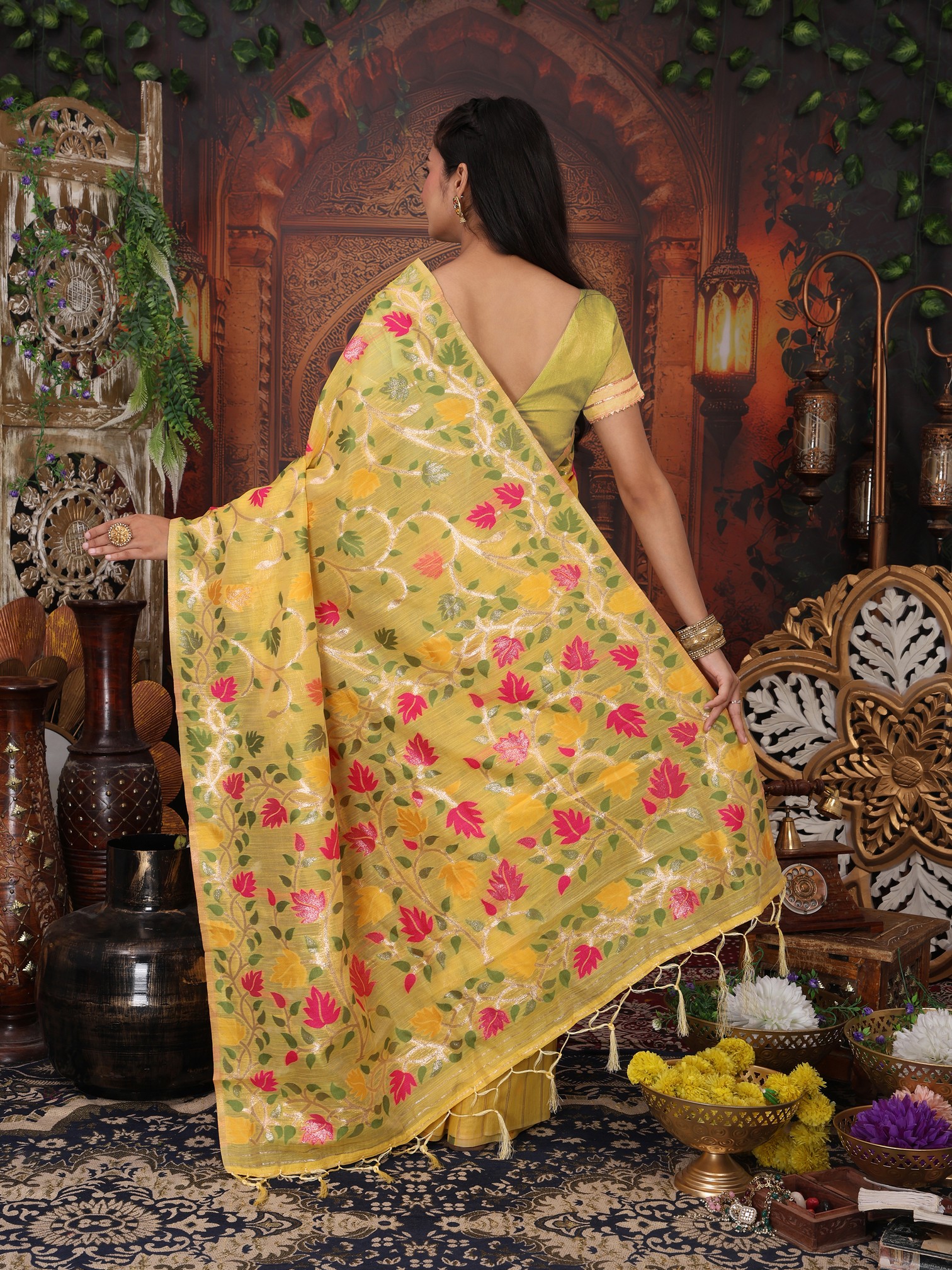 Yellow Color Linen Cotton Fabric Woven Designer Partywear Saree
