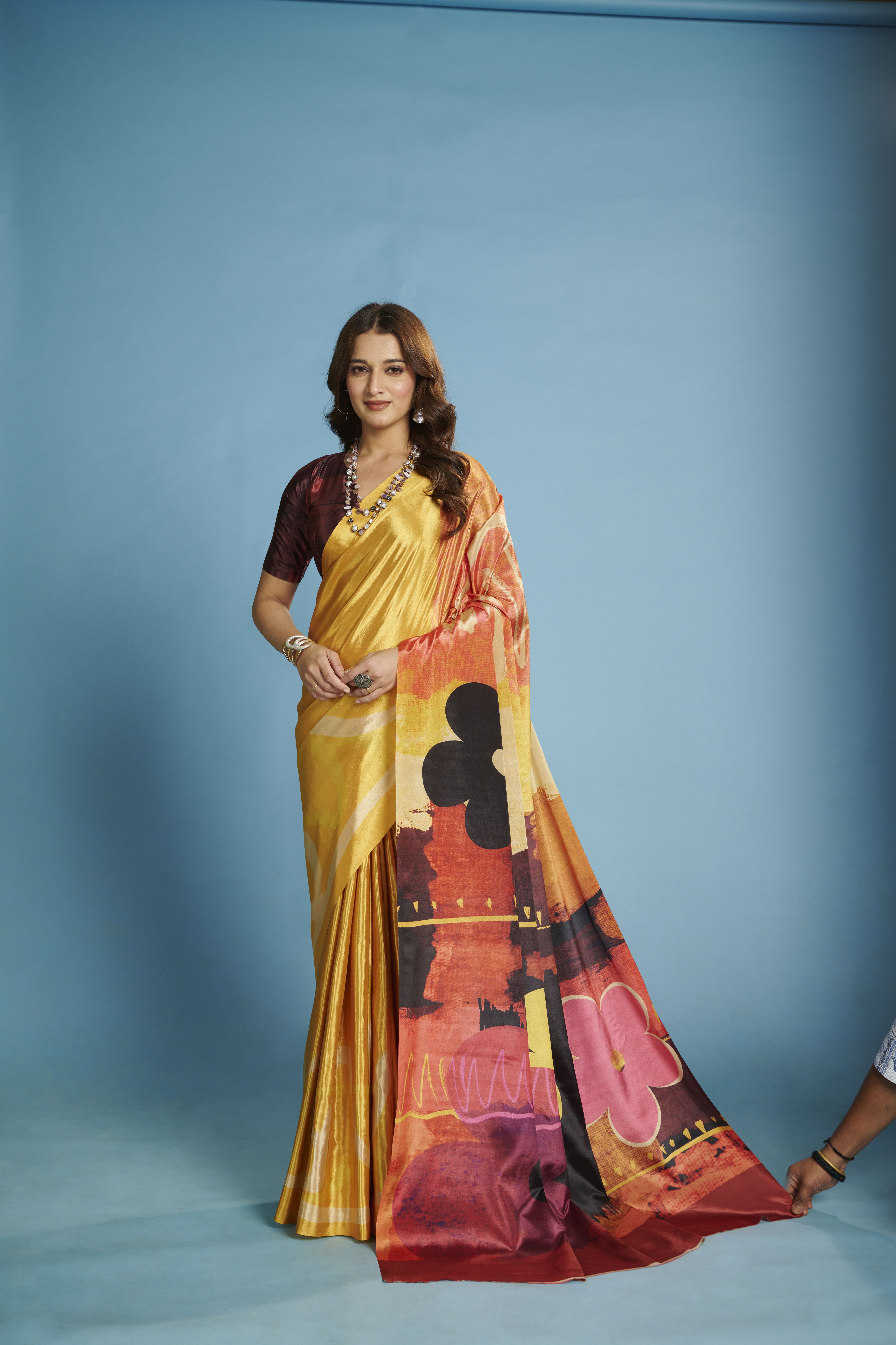 Yellow Color Malai Crepe Silk Fabric Beautiful Digital Printed Saree