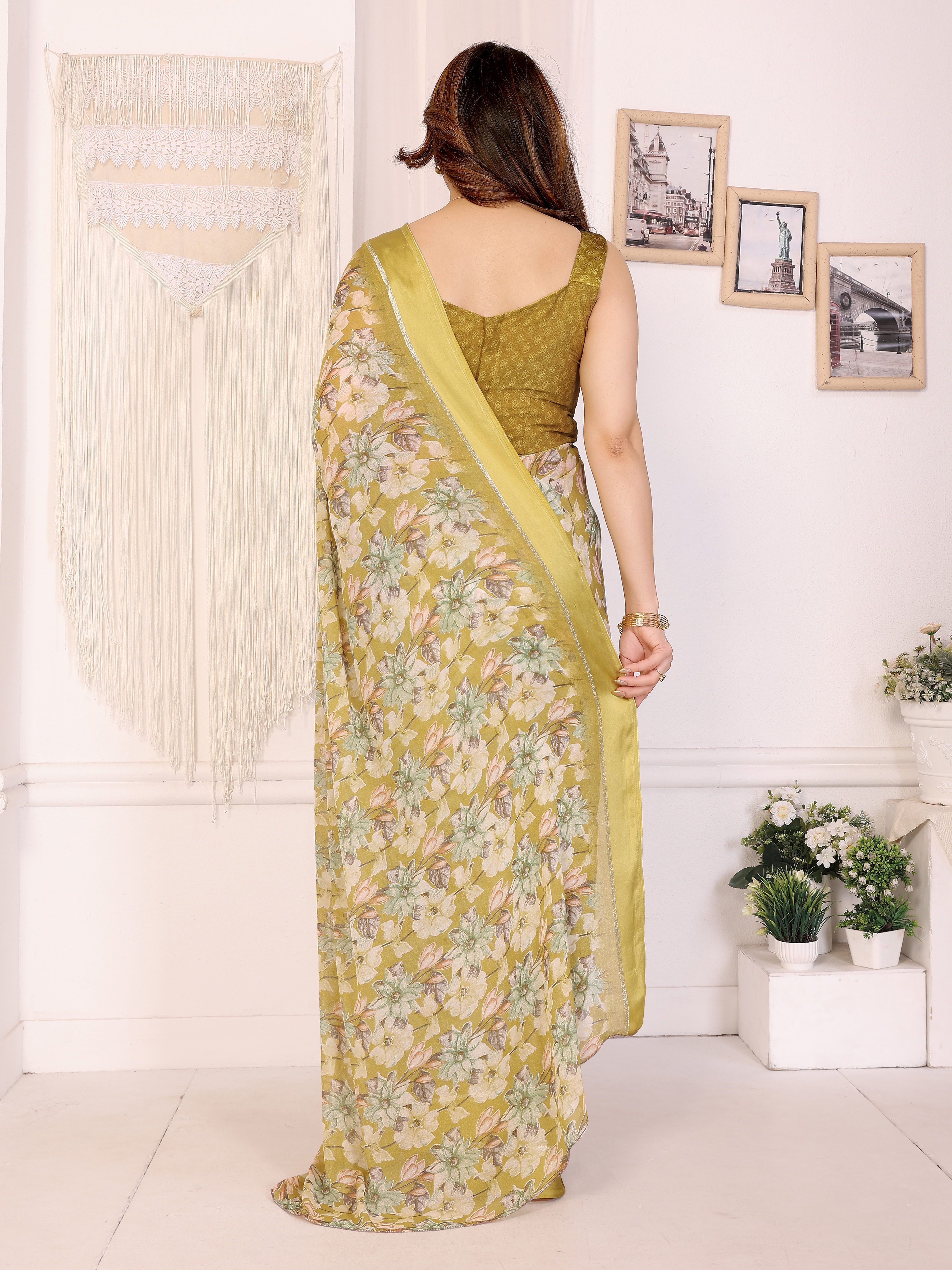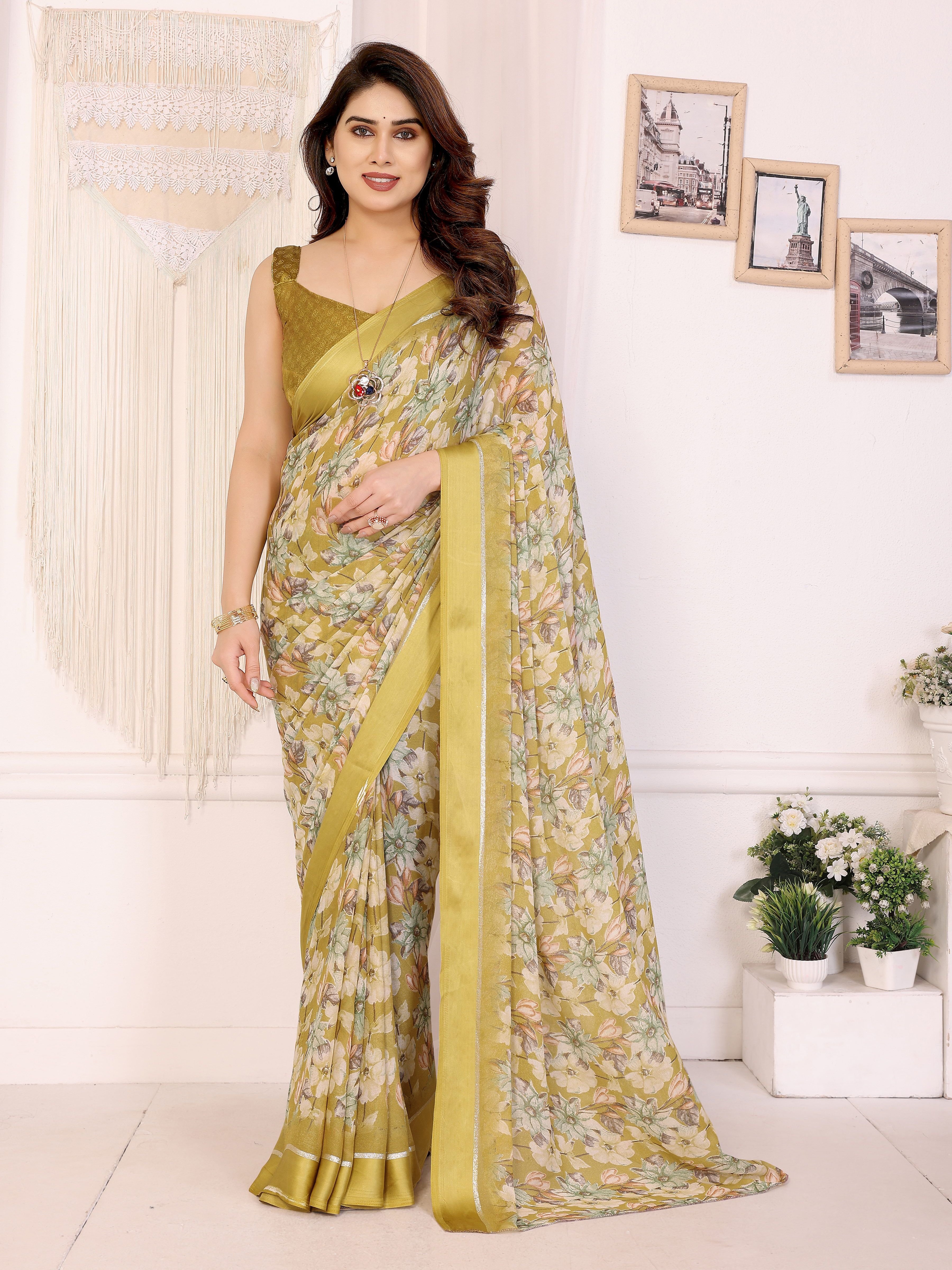Yellow Color Moss Satin Patta Designer Flower Printed Ceremonial Saree