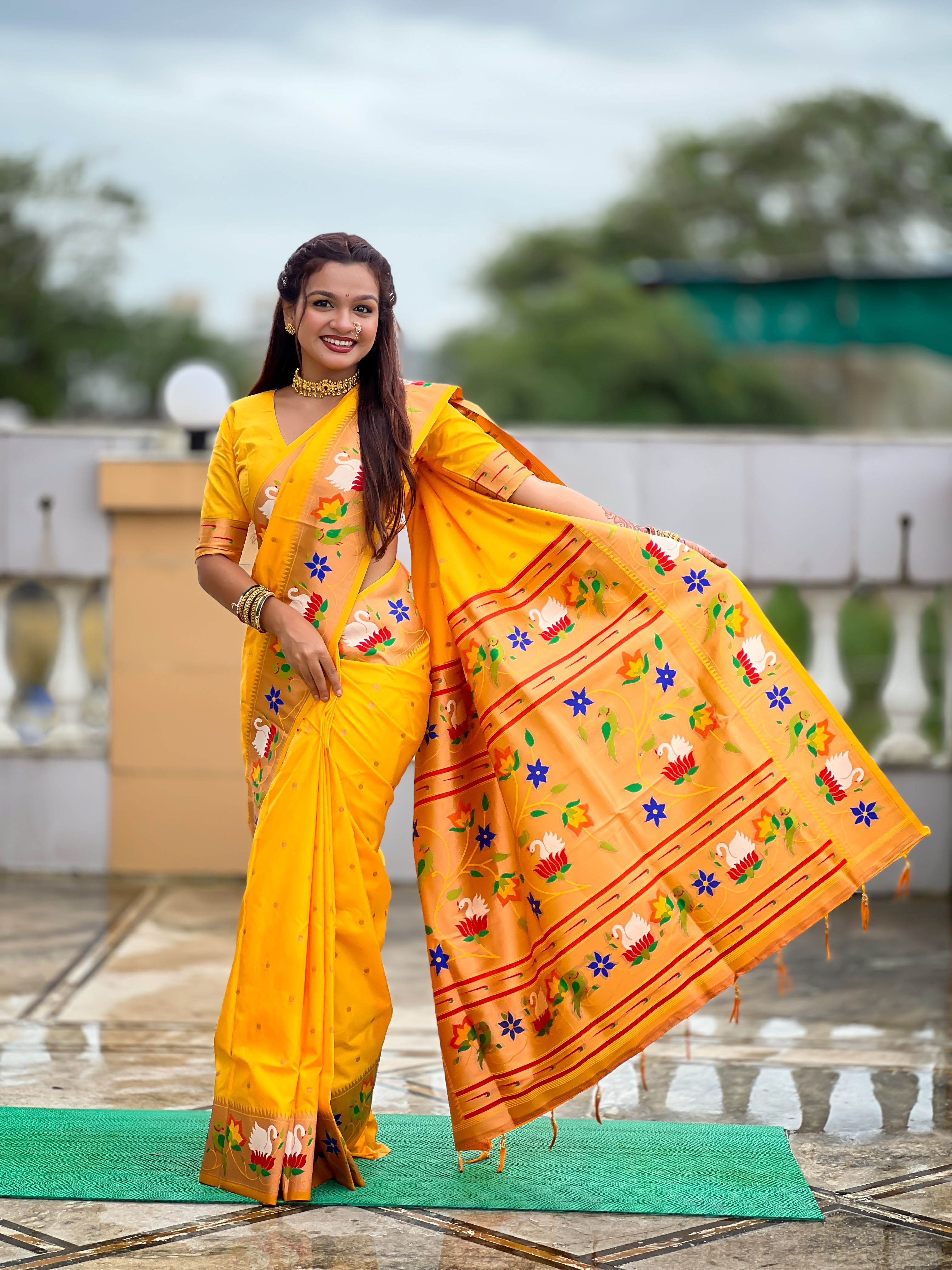 Yellow Color Paithani Silk Woven Meenakari Jacquard Designer Heavy Wedding Special Saree