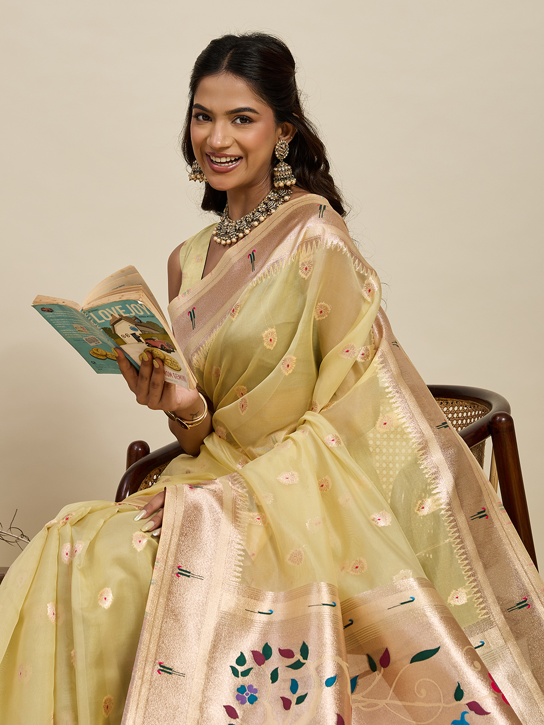 Garb This Party Wear Saree Paired With Blouse.This Saree And Blouse Are Cotton Silk Fabric With Woven Paithani Meenakari Designer. Buy This Pretty Saree Now.