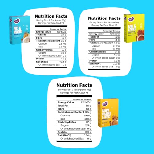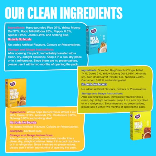 Pack 1 - Sprouted Ragi & Carrot Porridge mix 200g Pack 2 - Rice & Moong Porridge Mix 200g Pack 3 - Whole Wheat Almond & Date Porridge Mix 200g