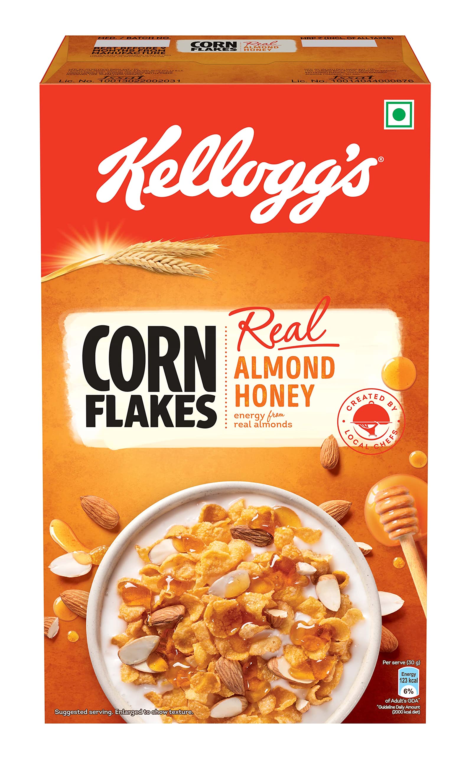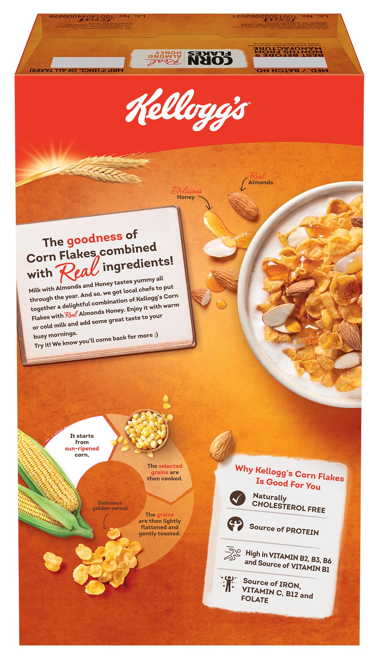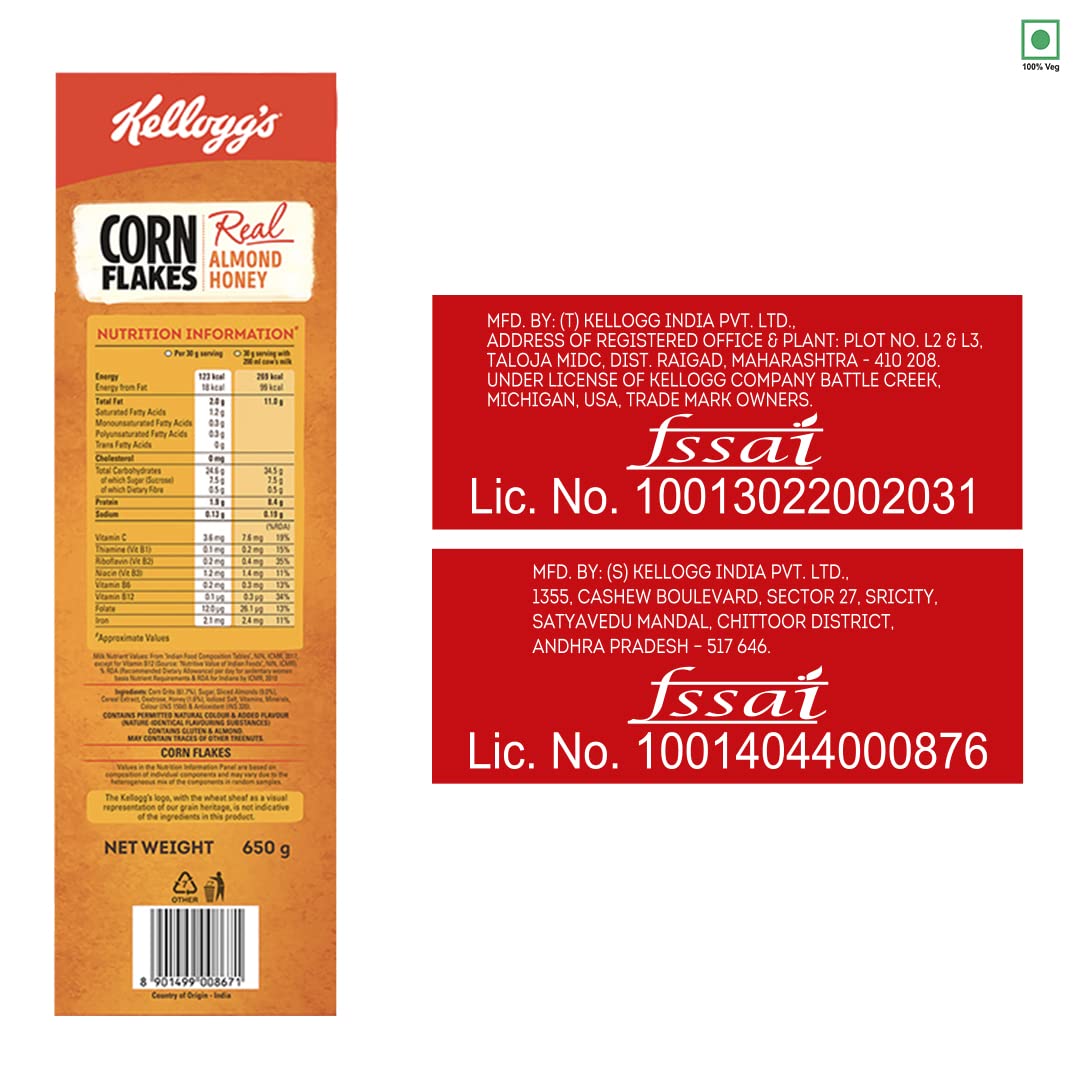 Packed with Nutrients - Now don't compromise on morning nourishment with Kellogg's Corn Flakes Real Almond Honey. It is not only yummy but is also High in Iron Vitamin B1 B2 B3 B6 C and a source of Vitamin B12 and Folate.