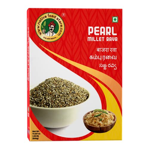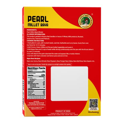 Pearl Millet Rava is pearl millet semolina for making a delicious breakfast. Also known as Bajra it is super healthy and packed with valuable nutrients to start the day off right. Pearl Millet (Pennisetumglaucum) is one of the oldest millet used by our ancestors and is one of the most important cereal grown in tropical semi arid regions of the world primarily Asia and Africa. It is known to have a very high fibre. Pearl Millet Rava is also ideal for making Pearl Rava Upma Rava Kichadi Rava Payasam Rava Pongal Rava Halwa Rava Idli Rava Appam etc. Native Food produces all its products exclusively with natural ingredients without preservatives without added colours and without flavour. Taste the difference.