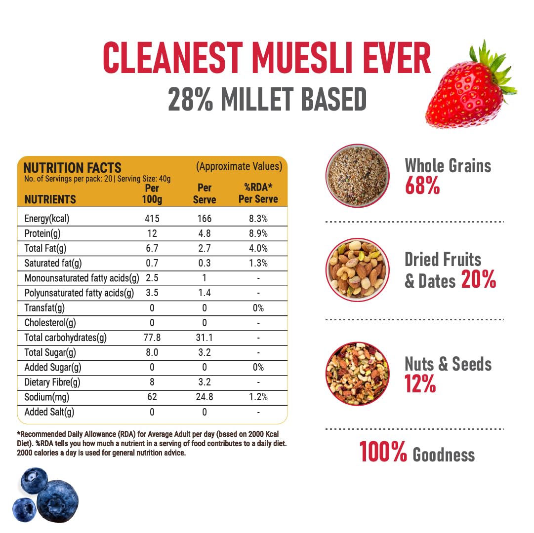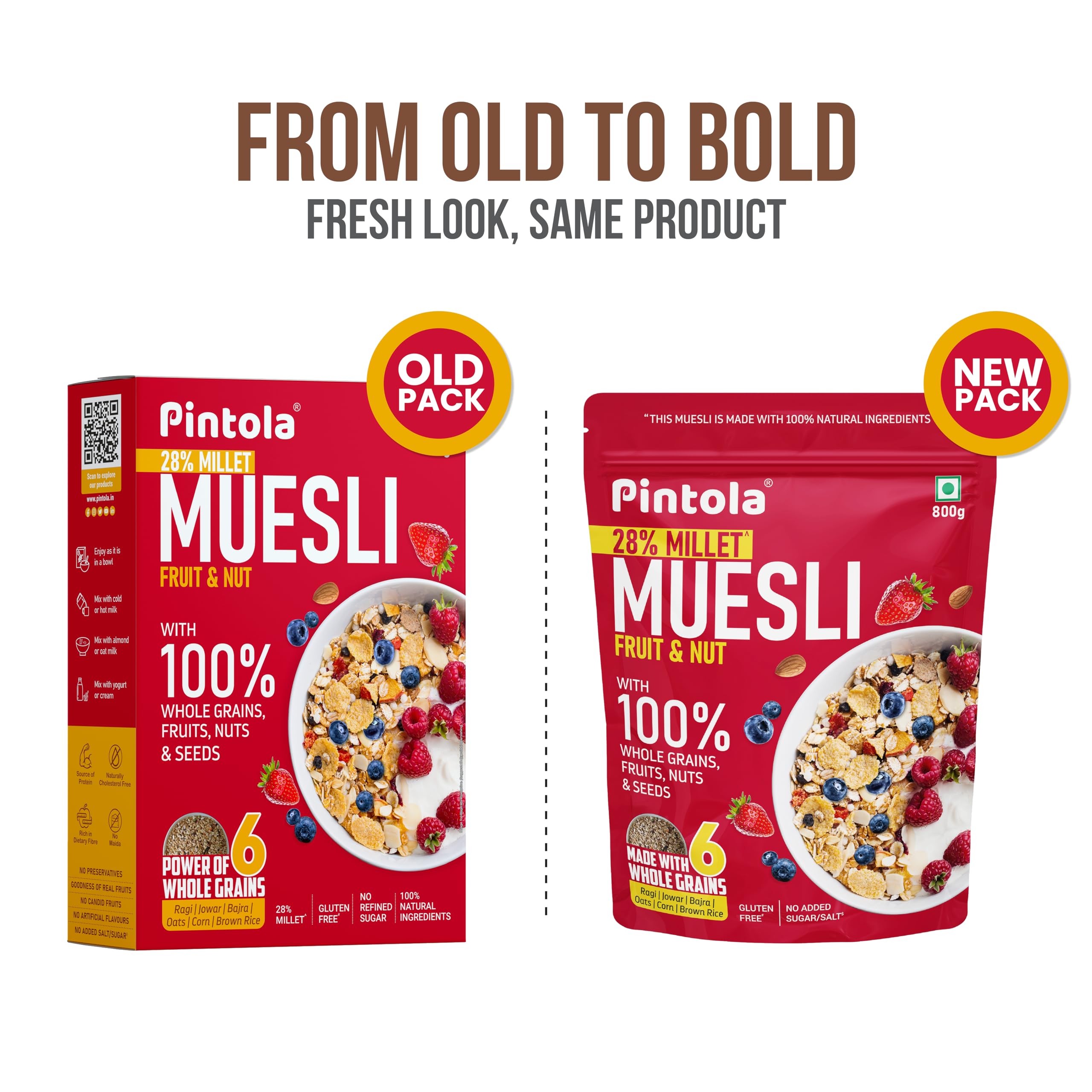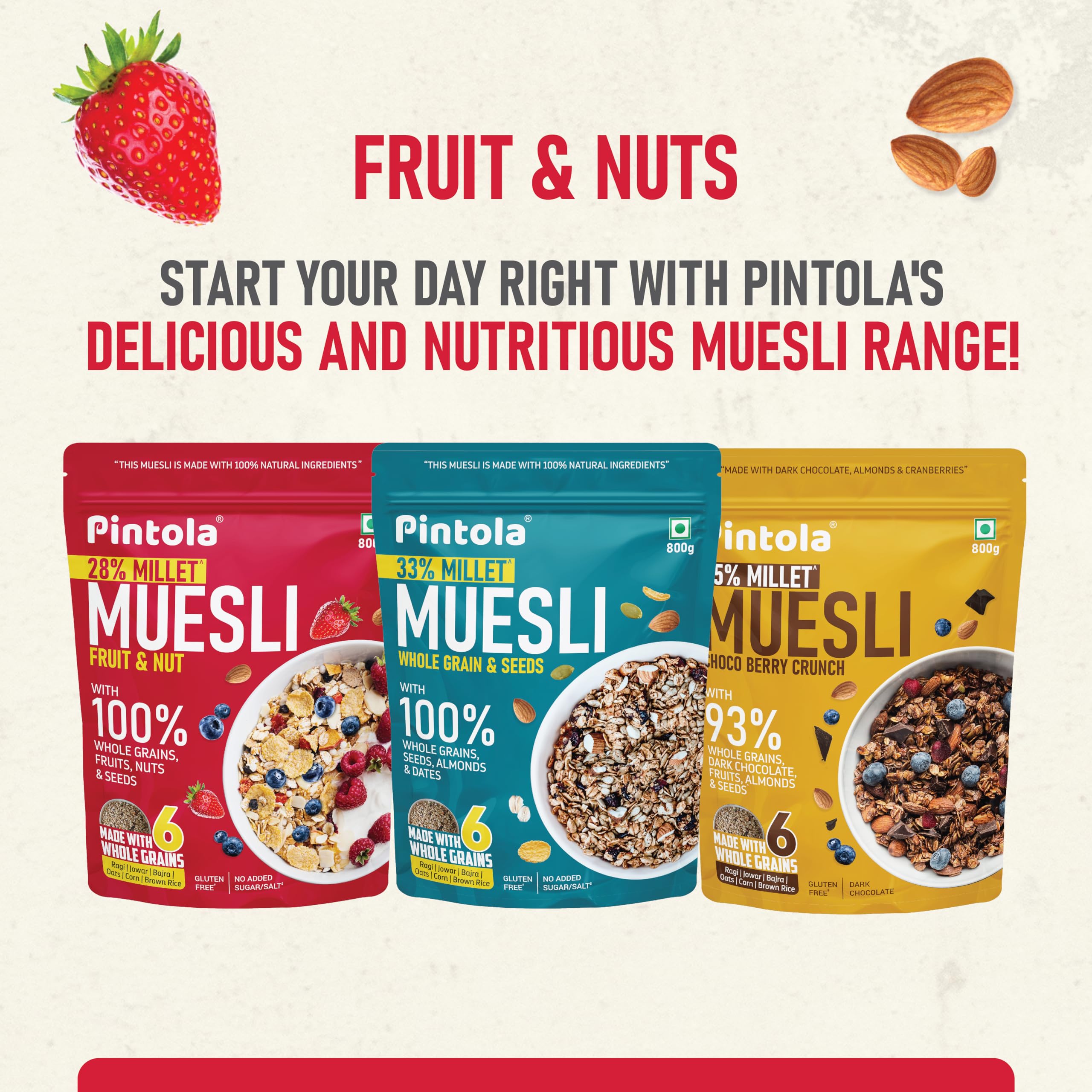 Pintola Fruit & Nut Muesli with 28% Millet & 68% Wholegrains (800g), Healthy-Fruity Breakfast cereal with 6 nuts, dried fruits & Dates, No Preservatives, No added sugar|Rich in Dietary Fibre & Protein