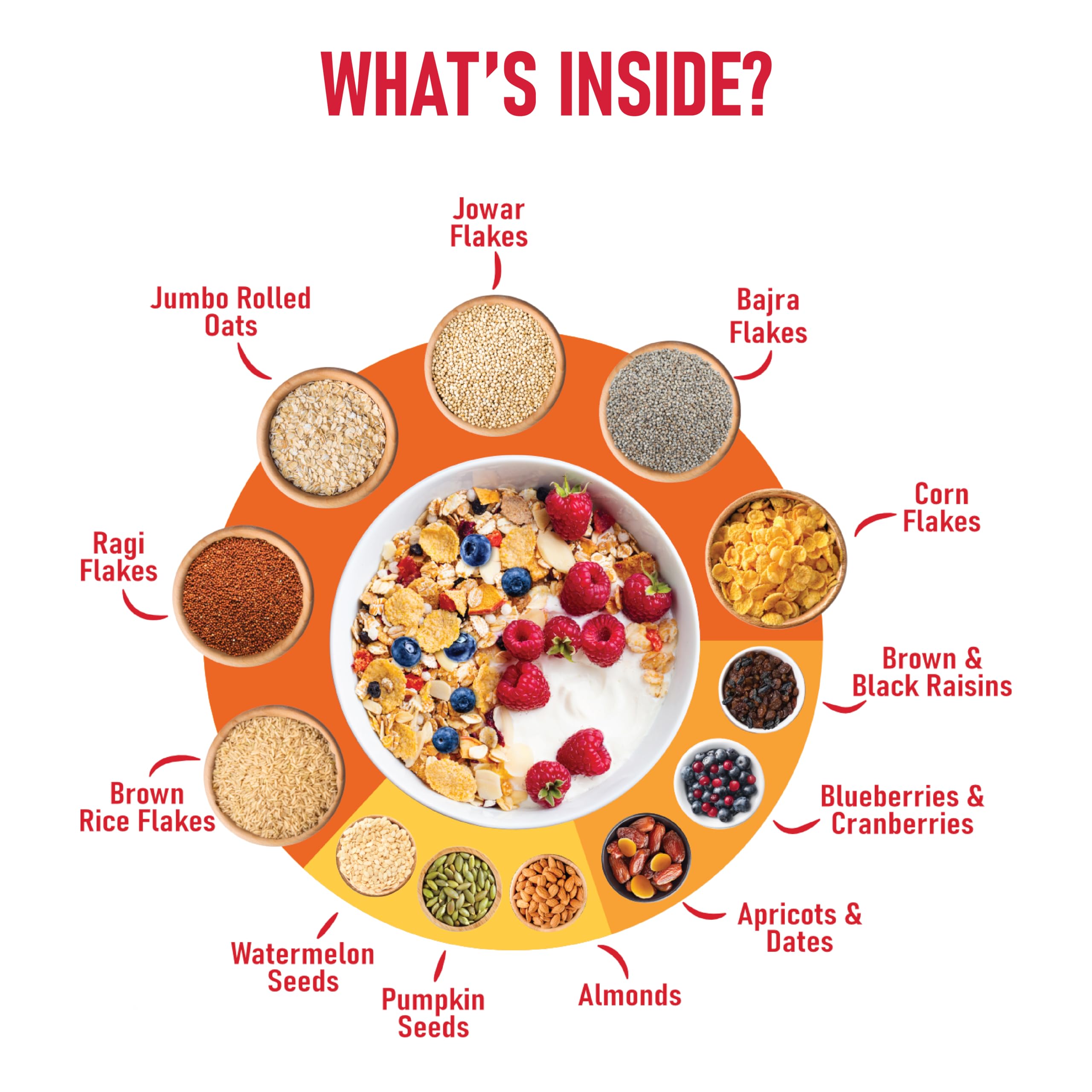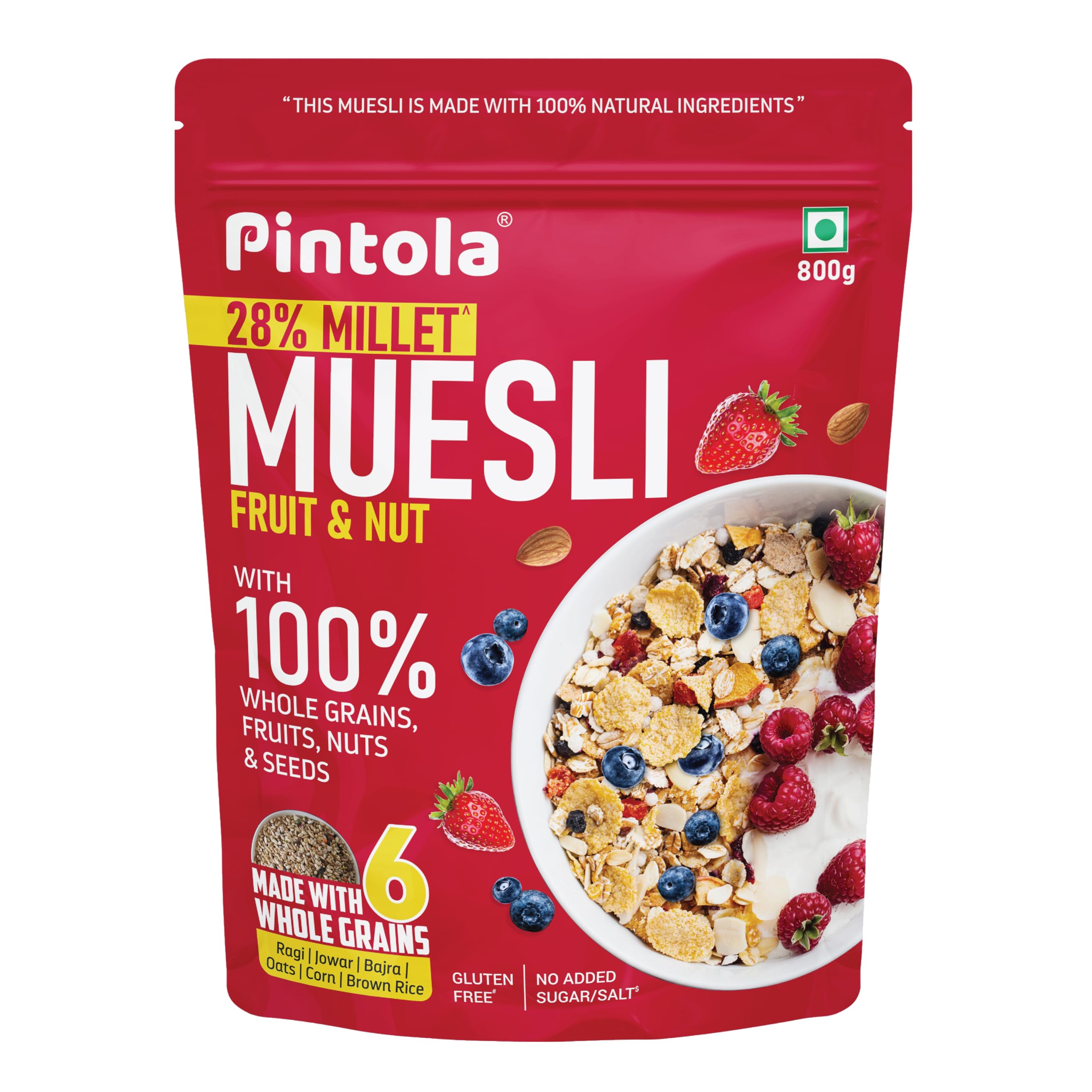 HomeGroceryHealthy BreakfastCereals & PorridgePintola Fruit & Nut Muesli with 28% Millet & 68% Wholegrains (800g), Healthy-Fruity Breakfast cereal with 6 nuts, dried fruits & Dates, No Preservatives, No added sugar|Rich in Dietary Fibre & Protein