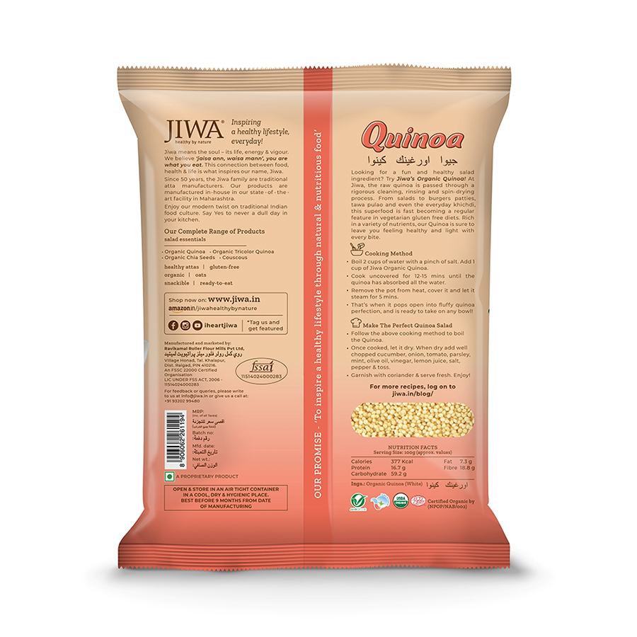 Looking for a fun and healthy salad ingredient? Try Jiwas Organic Quinoa! At Jiwa, the raw quinoa is passed through a rigorous cleaning, rinsing and spin-drying process to give you nothing but the best. From salads to burgers patties, tawa pulao and even the everyday khichdi, this high protein superfood is fast becoming a regular feature in vegetarian gluten free diets. Rich in a variety of nutrients, our Quinoa is sure to leave you feeling healthy and light with every bite.