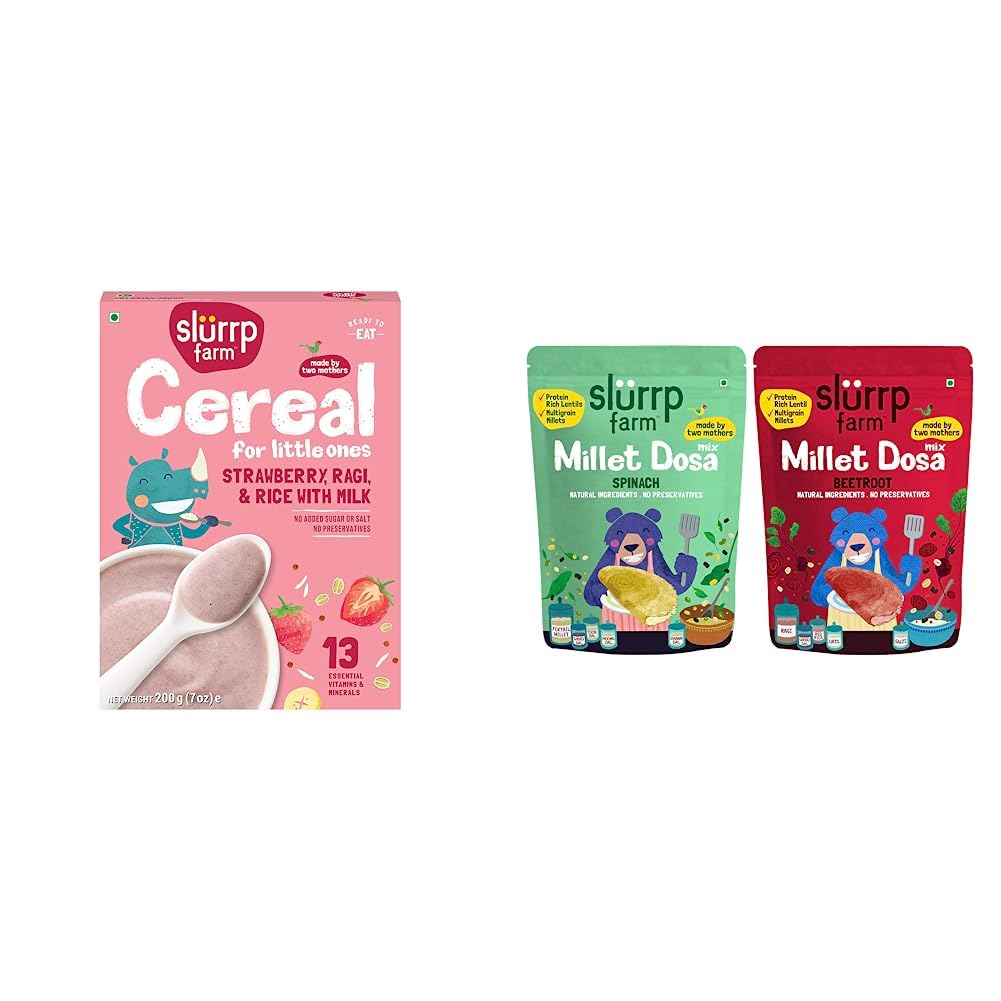 Slurrp Farm Baby Cereal Ragi Rice and Strawberry with Milk Instant Healthy Wholesome Food 200 g & Millet Dosa Instant Mix Supergrains Spinach and Beetroot Natural and Healthy Food 150