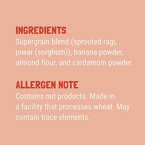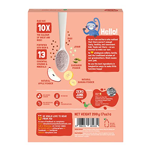 Slurrp Farm Ragi & Apple Cereal with No Sugar | Real Apple & Banana | Instant Cereal | Cereal with No Milk No Preservatives | 200gIntroduce your little one to solid foods with Slurrp Farm Cereal. Filled with the goodness of ragi jowar cardamom and real fruits like apple and banana. Sprouted Ragi which has 10X the calcium of wheat and rice and is easy to digest. Introduce new tastes to your little one. No added sugar No Salt No maida No milk No artificial colours. These easy to cook cereals are made by 2 mothers with lots of love.Slurrp Farm No Sugar No Salt Ragi Almond and Banana Cereal | 100% Sprouted Ragi | Healthy Cereal | No Milk | No Preservatives 200gIngredients: Sprouted Ragi Almond powder Banana Powder Cardamom Powder Vitamins and Minerals How to Use: 1. Add 1/2 cup of water or milk into a pan 2. Add 3 level table spoons (30 gms) of Cereal 3. Mix well to remove the lumps 4. Cook on a medium flame for 3-5 mins and stir continuously to avoid lumps 5. Cool to room temperature and feed immediately | Once the pack is opened transfer the contents to an airtight container store in cool dry place or in a refrigerator | At Slurrp Farm brand made by 2 Mothers we are passionate about raising awareness of healthy eating for children and giving busy parents like us the convenience needed in terms of being able to find food options which are as good as what we would make at home.