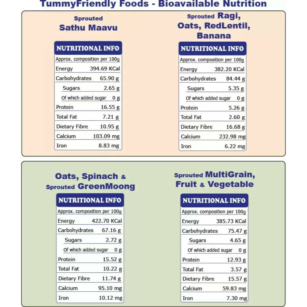 TummyFriendly Foods Organic Certified Stage3 Sprouted Porridge Mixes Combo - 4 Packs With Oats for 8 Months Old BabyThis pack contains:TummyFriendly Foods Certified Stage3 Porridge Mixes Trial Packs - Ragi - 200 gmTummyFriendly Foods Certified Stage3 Porridge Mixes Trial Packs - MultiGrain - 200 gmTummyFriendly Foods Certified Stage3 Porridge Mixes Trial Packs - Oats - 200 gmTummyFriendly Foods Certified Stage3 Porridge Mixes Trial Packs - Sathu Maavu - 200 gmAge Group: 8+ MonthsIngredients:Organic Ragi, Oats, Sathu Maavu, MultiGrainLegal Disclaimer: Product images are for illustrative purposes only. Images/packaging/ labels may vary from time to time due to changes made by the manufacturer's manufacturing