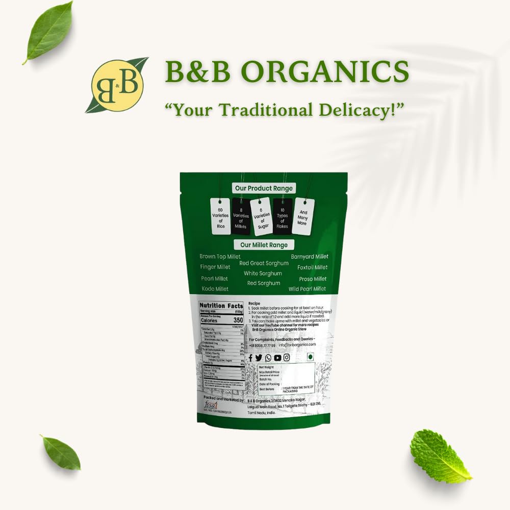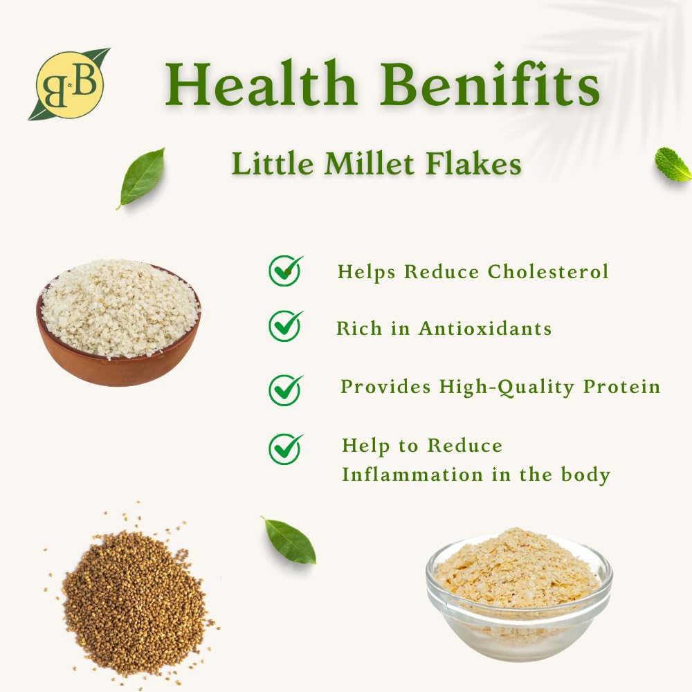 Lab test: Although B&B Organics procure their products from certified farmers B&B Organics periodically lab test their organic products to maintain its high quality and to prevent contamination.Health Benefits (Imprecise) :Little millet is also called as king of cereals because of its rich nutritional and medicinal value. It contains high phosporous. It especially good for people who has low body mass.It is a rich source of B-vitamins minerals like calcium iron zinc potassium among others Suitable for growing kids to strengthens the body. Itâs complex carbohydrates digest slowly which is very helpful for diabetic patients.Nutrition Value:100gms of little millet has Protein-7.7 gFat-5.2gFiber-7.6gMinerals- 1.5gIron- 9.5 mgCalcium- 17 mgCalories -207 kcal.