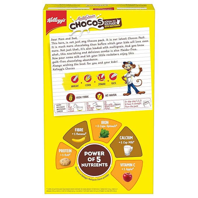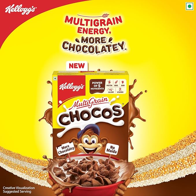Kellogg's Choco Flakes:Kellogg's Chocolates: A Delicious and Nutritious Start to Your Day. Make breakfast more exciting with Kellogg's Chocos, crunchy whole wheat puffs with a delicious chocolate taste!About The Product:Made with whole wheat for extra fiber.High calcium and protein content for healthy bones and muscles.Contains 10 vital vitamins and minerals.Makes milk chocolatey and tasty.Ideal for children and fun-loving adults.Ingredients:Whole wheat flour, sugar, alkali-processed cocoa powder, rice flour, corn oil, malt extract, salt, vitamins (Vitamin C (Sodium Ascorbate), Niacinamide, Iron (Reduced Iron), Vitamin B6 (Pyridoxine Hydrochloride), Vitamin B2 (Riboflavin), Vitamin B1 (Thiamine Mononitrate), Folic Acid), and artificial flavors.Benefits:Boosts energy levels - May promote immunological health (thanks to Vitamin C content)Calcium contributes to the strength of bones and teeth.Protein may aid in muscle development and maintenance.A quick and simple breakfast choice.Directions:Pour the required amount of Kellogg's Chocos into a bowl. Add milk and enjoy!About The Brand:Kellogg's has spent over a century providing families with healthful and enjoyable breakfast alternatives. They employ high-quality ingredients to make cereals enjoyed by people of all ages. Kellogg's is dedicated to helping families start their days off correctly.Kellogg's Chocos FAQ's:1. Are Kellogg's Chocolates acceptable for vegetarians?Yes, Kellogg's Chocos are vegetarian.2. How should I store Kellogg's Chocolates?Kellogg's Chocos should be stored in a cool, dry area to maintain their quality.3. Is there another flavor of Kellogg's Chocos?In certain areas, Kellogg's sells Chocos in vanilla or chocolate and vanilla tastes.Disclaimer: The product is guaranteed to be 100% genuine.