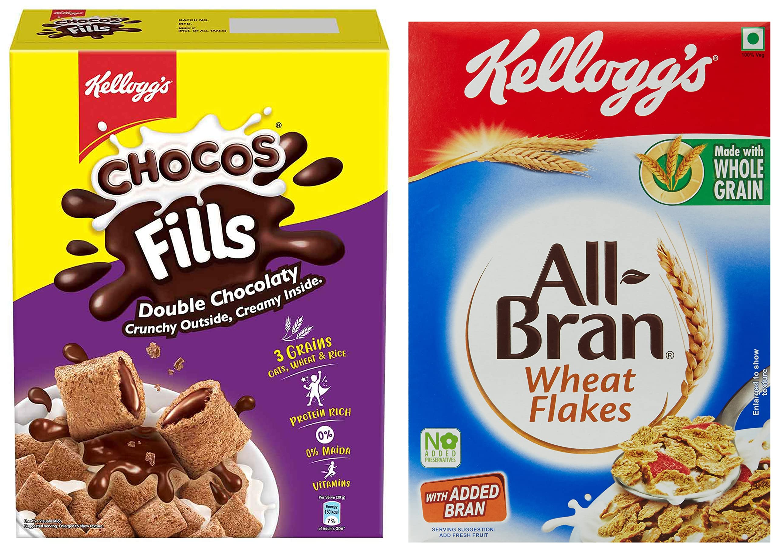 Kellogg's Chocos Fills | Double Chocolaty |Multigrain | High in Protein | 0% Maida | High in B Vitamins | Anytime Snack |250gPresenting kelloggs chocos fills centre filled pillows which are crunchy chocolaty outside and chocolaty inside. It is an anytime anywhere snack. Experience yummy taste of kelloggs chocos fills during breakfast between lectures while travelling or late night munching.Kellogg's All Bran Wheat Flakes 440gKellogg's All Bran Wheat Flakes Breakfast Cereals are made with whole wheat and wheat bran which is a very healthy combination. These wheat flakes make a delicious and quick breakfast. Combining Kellogg's Wheat Flakes with milk will give you the benefits of both. You can also garnish it with fruits and nuts to give your dish an exciting look and yummy taste.