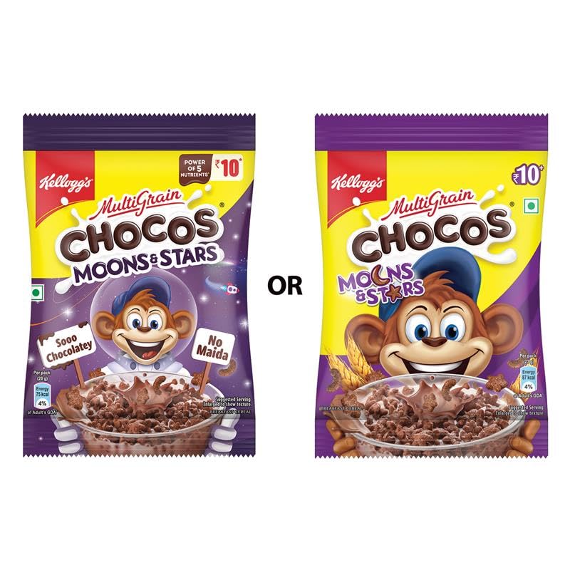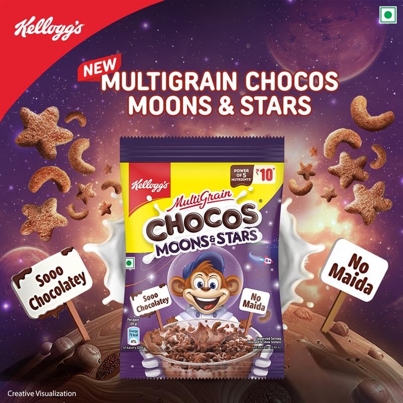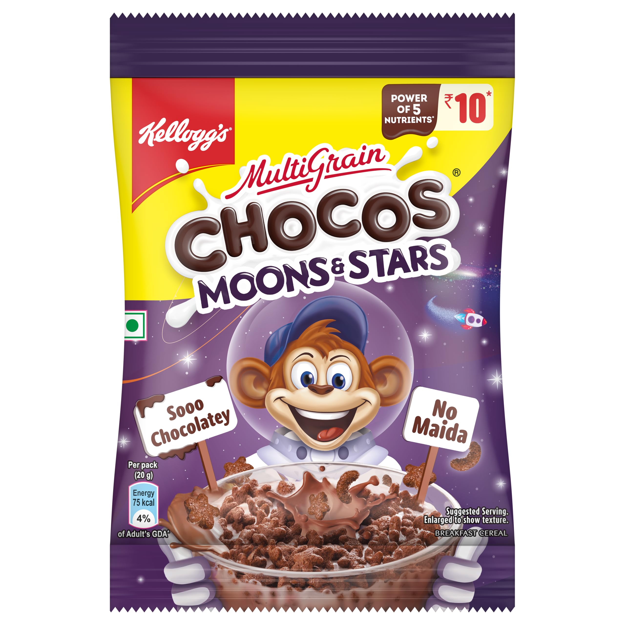KelloggChocos Moons & Stars adds taste and fun to your childmilk bowl. The chocolaty crunchy and grain-based cereal makes for a nourishing breakfast meal evening snack or a late night treat!â