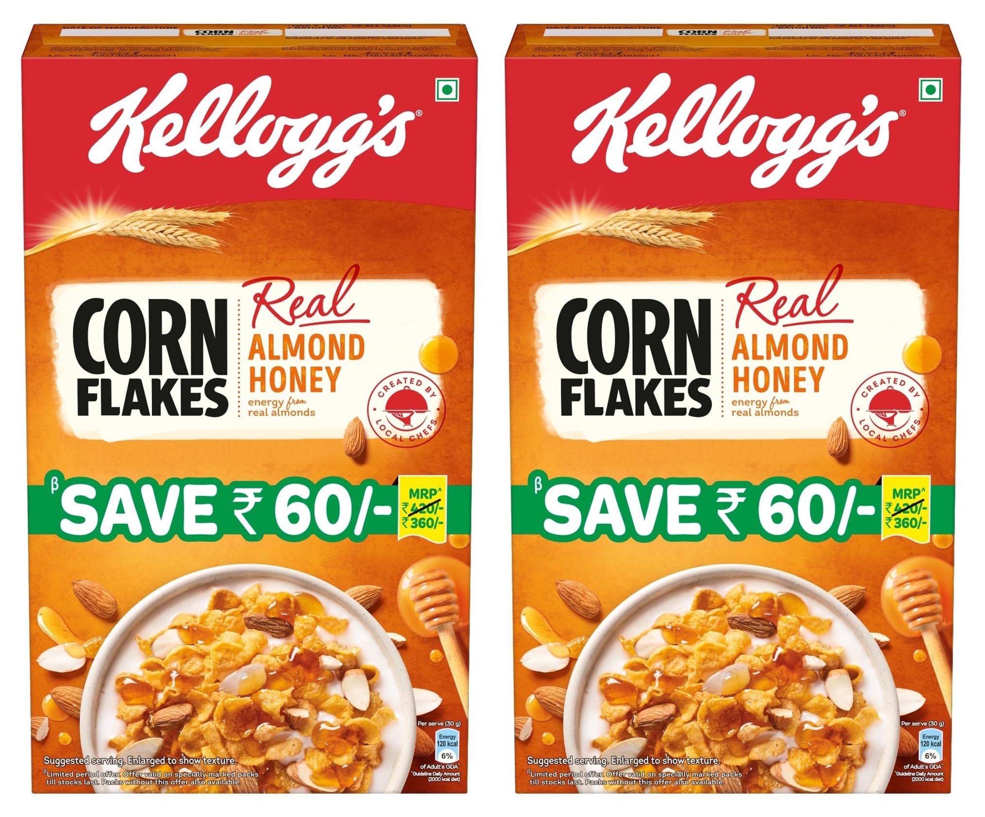 Kellogg's Corn Flakes Real Almond Honey 650g | High in Iron Vitamin B1 B2 B3 B6 & C | Naturally Cholesterol Free | Corn Flakes Breakfast Cereal (Pack of 2)
