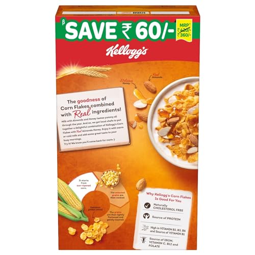 Packed with Nutrients - Now don't compromise on morning nourishment with Kellogg's Corn Flakes Real Almond Honey. It is not only yummy but is also High in Iron Vitamin B1 B2 B3 B6 C and a source of Vitamin B12 and Folate.