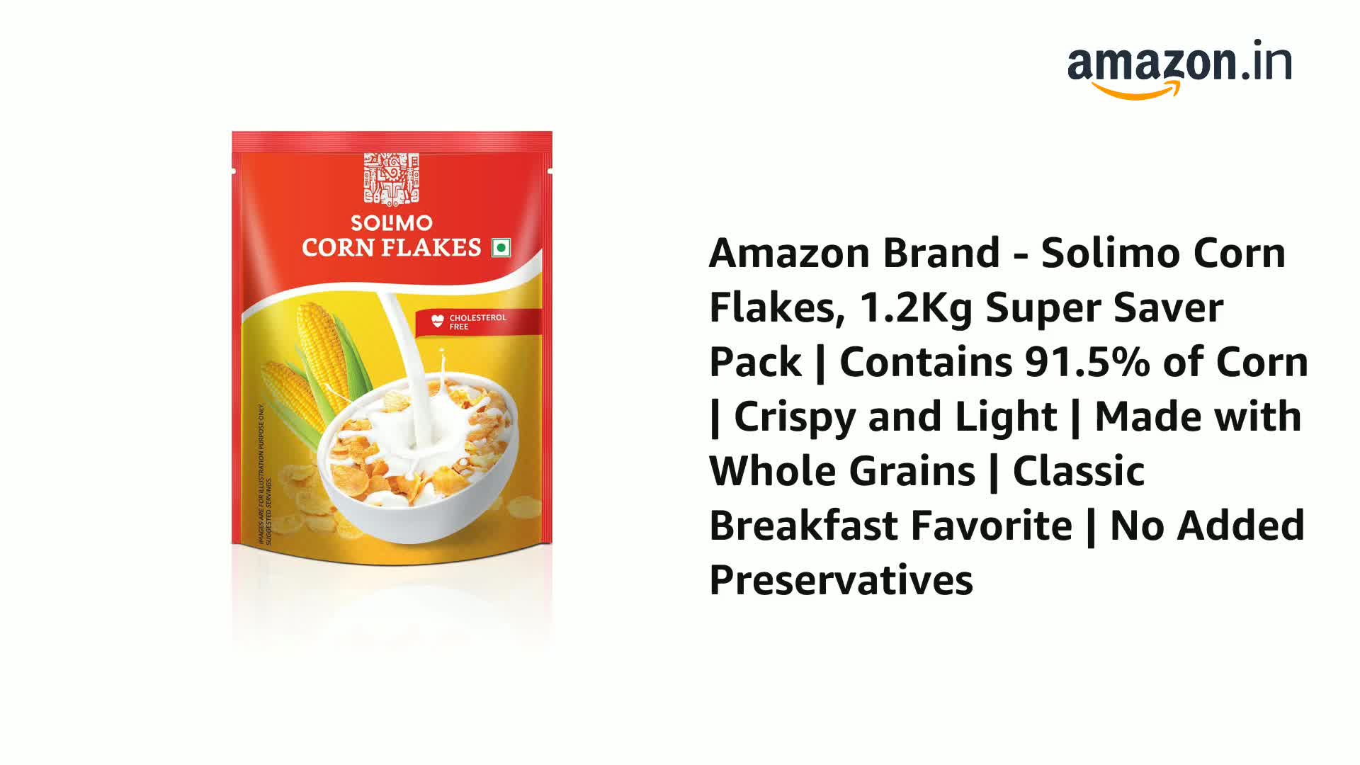 Introducing the Amazon Brand Solimo Corn Flakes 1.2 kg Super Saver Pack. Made with 91.46% Corn the corn flakes are a delicious breakfast meal and a great way to start your day The corn flakes are also naturally cholesterol-free and low in saturated fat. It can be made very easily making it a time-saving meal for those living a busy lifestyle. The corn flakes come with a resealable pouch to ensure that the product can be stored easily and also make for a convenient on-the-go snack