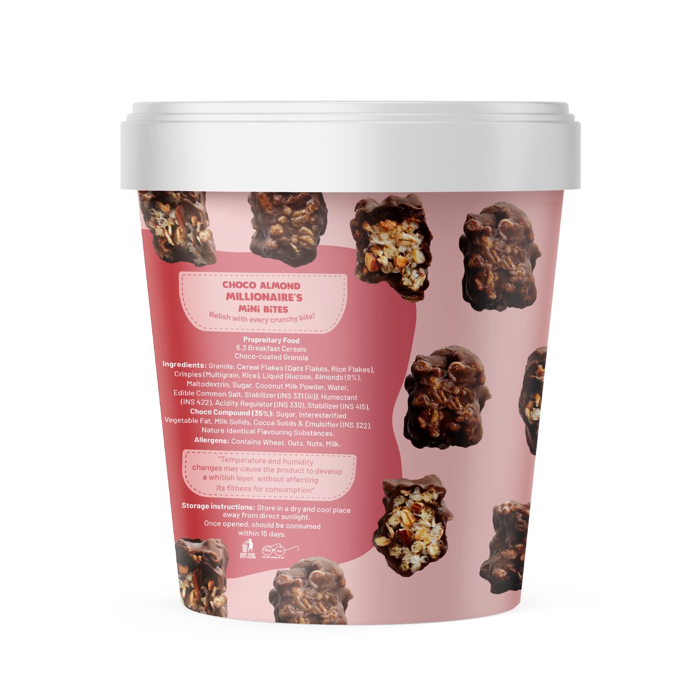 • Ingredients Cereal Flakes (Oats Flakes Rice Flakes) Crispies (Multigrain Rice) Liquid Glucose Almonds (9%) Sugar Coconut Milk Powder Water Common Salt Choco Compound (35%) Sugar Milk Solids Cocoa Solids & Nature Identical Flavouring Substances
