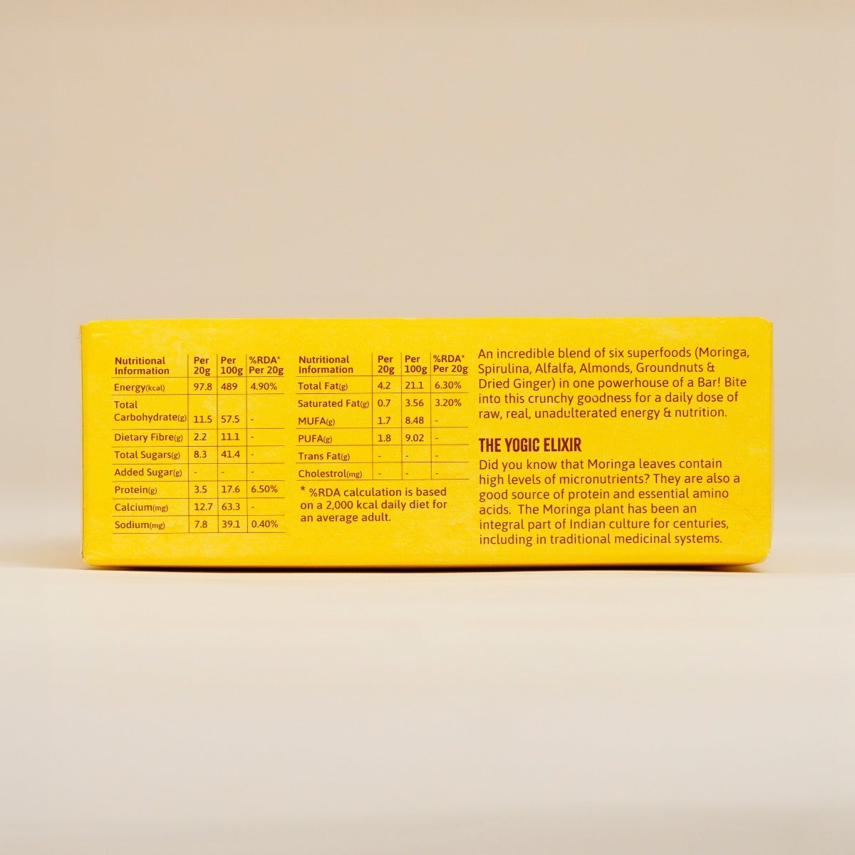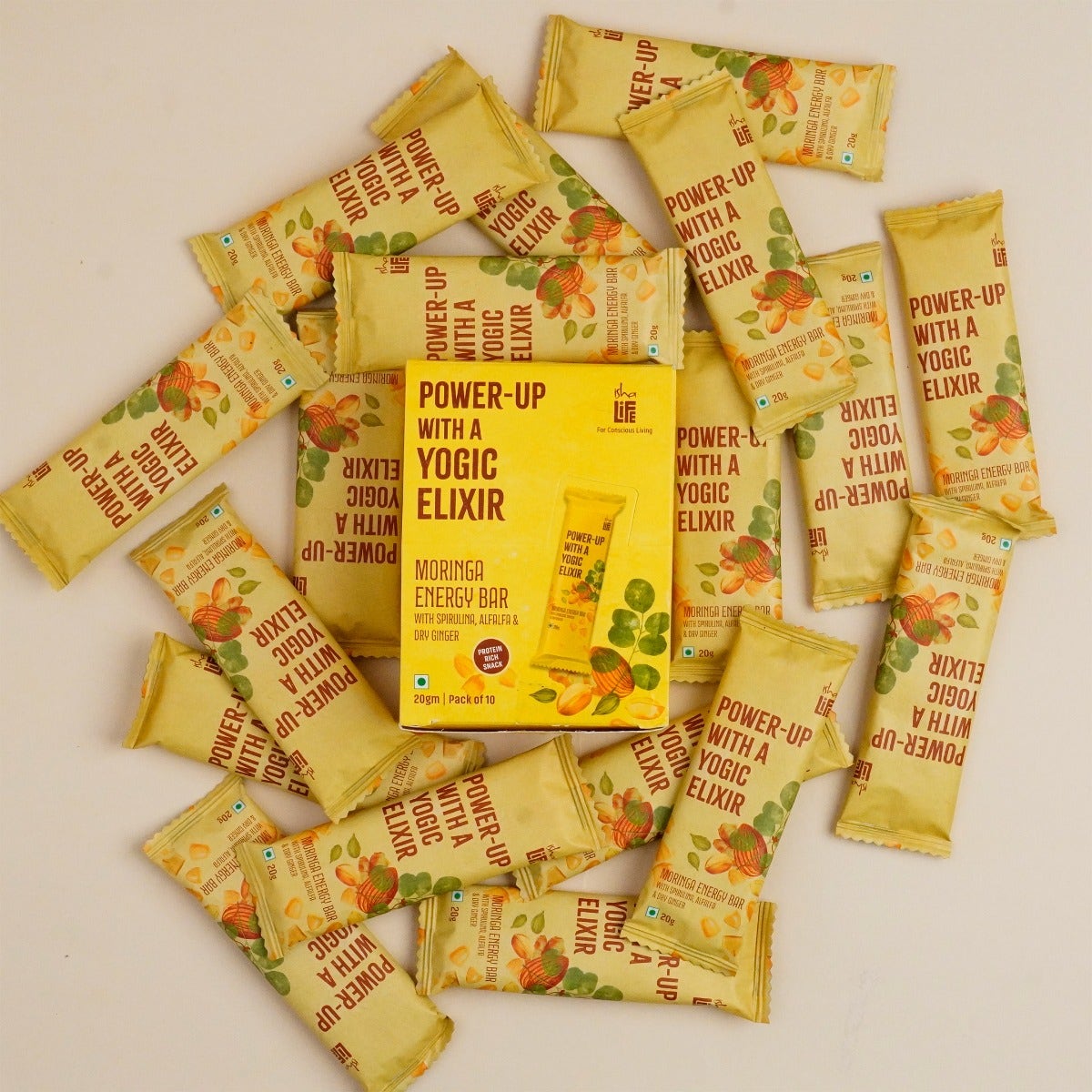 Embrace the joy of guilt-free snacking with Isha Life! Introducing nutrient-dense delights crafted from highly pranic ingredients and steeped in yogic wisdom.This powerhouse of a bar is an incredible blend of six superfoods including groundnut, spirulina, alfalfa, almond, jaggery, cardamom, and dry ginger. It also contains Moringa, a yogic wonder. For centuries, it has been an integral part of yogic culture and ancient medicinal systems. Moringa is rich in micronutrients, protein, and essential amino acids. With no added preservatives, oil, gluten, refined sugar, or artificial ingredients, this pack of 10 bars is a power-packed treat perfect for sharing with your family and friends.