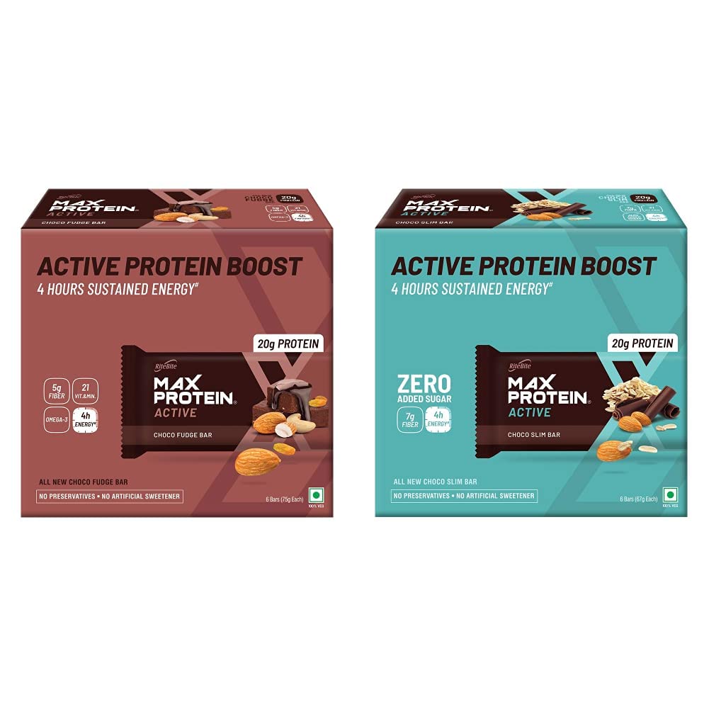 RiteBite Max Protein Active Choco Fudge Bars 450g - Pack of 6 (75g x 6)Power through the day with the 20g RiteBite Max Protein Choco Fudge Bar â the perfect power snack that is healthy handy and delicious. This Max Protein Active Bar fuels you with 4 hours of sustained energy. To top it off it is layered with a delicious Choco Fudge flavour making it absolutely irresistible.RiteBite Max Protein Active Choco Slim Bars 402g - Pack of 6 (67g x 6)Striking the right balance between health and taste the 20g RiteBite Max Protein Choco Slim Bar slips right into your active lifestyle. Packed with Omega fiber vitamins and minerals this bar fuels you with 4 hours of sustained energy making it the perfect go-to Power Snack.