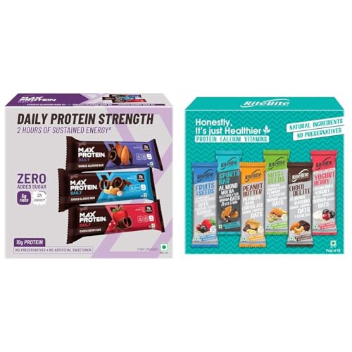 RiteBite Max Protein Daily Assorted 10g Protein Bars (Pack of 6)Max Protein Daily Assorted - Choco Almond x 2 Choco Berry x 2 Choco Classic x 2 (Pack of 6) 300gRiteBite Max Protein Nutrition Assorted Bar375g (Choco Delite-1 * 40g Yogurt Berry-1 * 35g Peanut Butter-2 * 40g Fruits & Seeds-2 * 35g Nuts & Seeds- 2 * 35g Sports Bar-2 * 40g) (Pack of 10)A BAR FOR EVERYONE: With high protein & fiber Max Protein bar is the perfect bar for your hectic lifestyle with no preservatives with a balance of taste and health and being 100% vegetarian. SUSTAINED ENERGY: Max Protein bars are your go to performance energy bar purposefully crafted with an ideal mix of 3 protein blends of whey protein soy and casein for sustained energy. WHOLESOME INGREDIENTS FOR A WHOLESOME EXPERIENCE: A bar that satiates your hunger and keeps you going with hrs of sustained energy. We aim to keep you healthier and provide a healthier option to your food choices with an irresistible combo of nutrition and flavor YOUR ENERGY BUDDY: No time for breakfast before the video call? Need something energy boost for the grocery run? Got that midnight movie craving? Choose the healthier Max Protein bars as your energy and nutrition buddy. Don't skip on your health and weight goals. Have this bar handy for all the time whenever bored or binge eating hits you. MADE IN INDIA : Max Protein is the first brand to launch nutrition & protein bars in India. We have created and nurtured protein bars category in Indian Market.