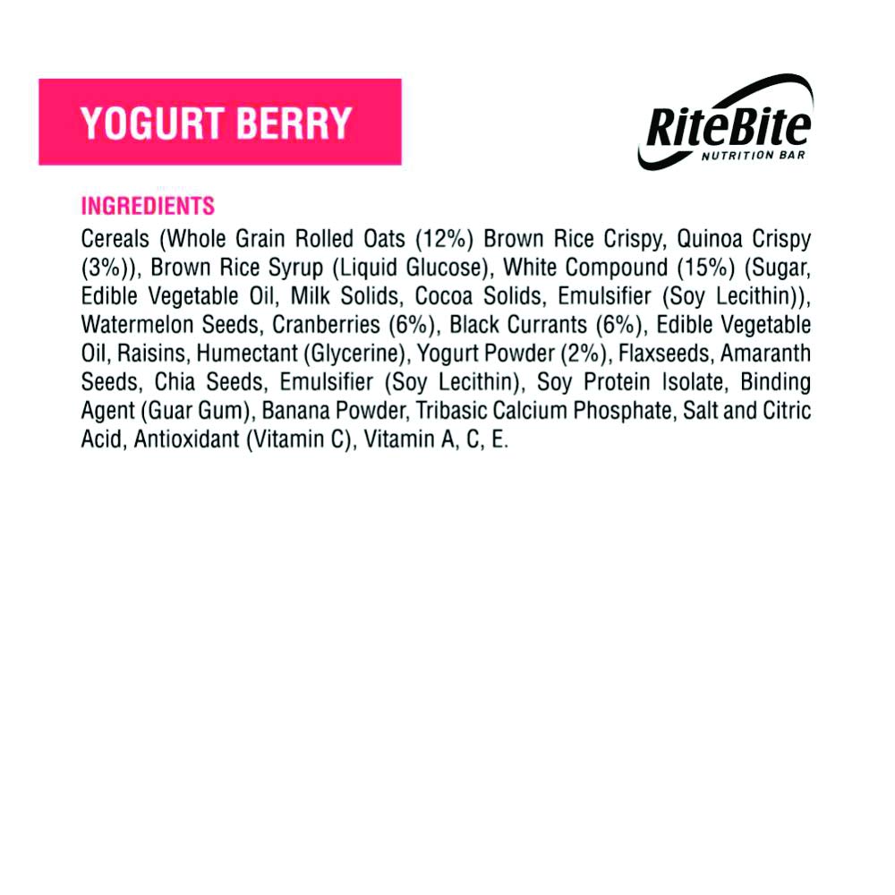 BERRY BERRY DELICIOUS Loaded with lots of cranberries blackcurrants & af-course the smooth & delightful creaminess of yogurt. It's just like a joy ride for your senses. NUTRITION AND LOT MORE Enjoy the rewarding taste of RiteBite Yogurt Berry snacking bar which has the goodness of cranberries and black currant that serve as a source of antioxidant and Vitamin C Oats that delivers Fibre and yogurt serves as an excellent probiotic and quinoa provides sustained energy with Low GI. A product with clean and natural ingredients and no preservatives. YOUR GO TO SNACK A pack full of goodness for all your sweet cravings. No more guilt for your midnight binge or when you have a craving for something sweet. This little pack can get you through all those tiring commutes or even those quick exercise sessions. We have got you covered. ANYTIME INDULGENCE Your post-run pre-workout energy boost in-between meals sitting in traffic on-the-go anytime RiteBite delivers wholesome delicious energy all wrapped up and ready to go." MADE IN INDIA We are truly local & Proudly Vocal about it.