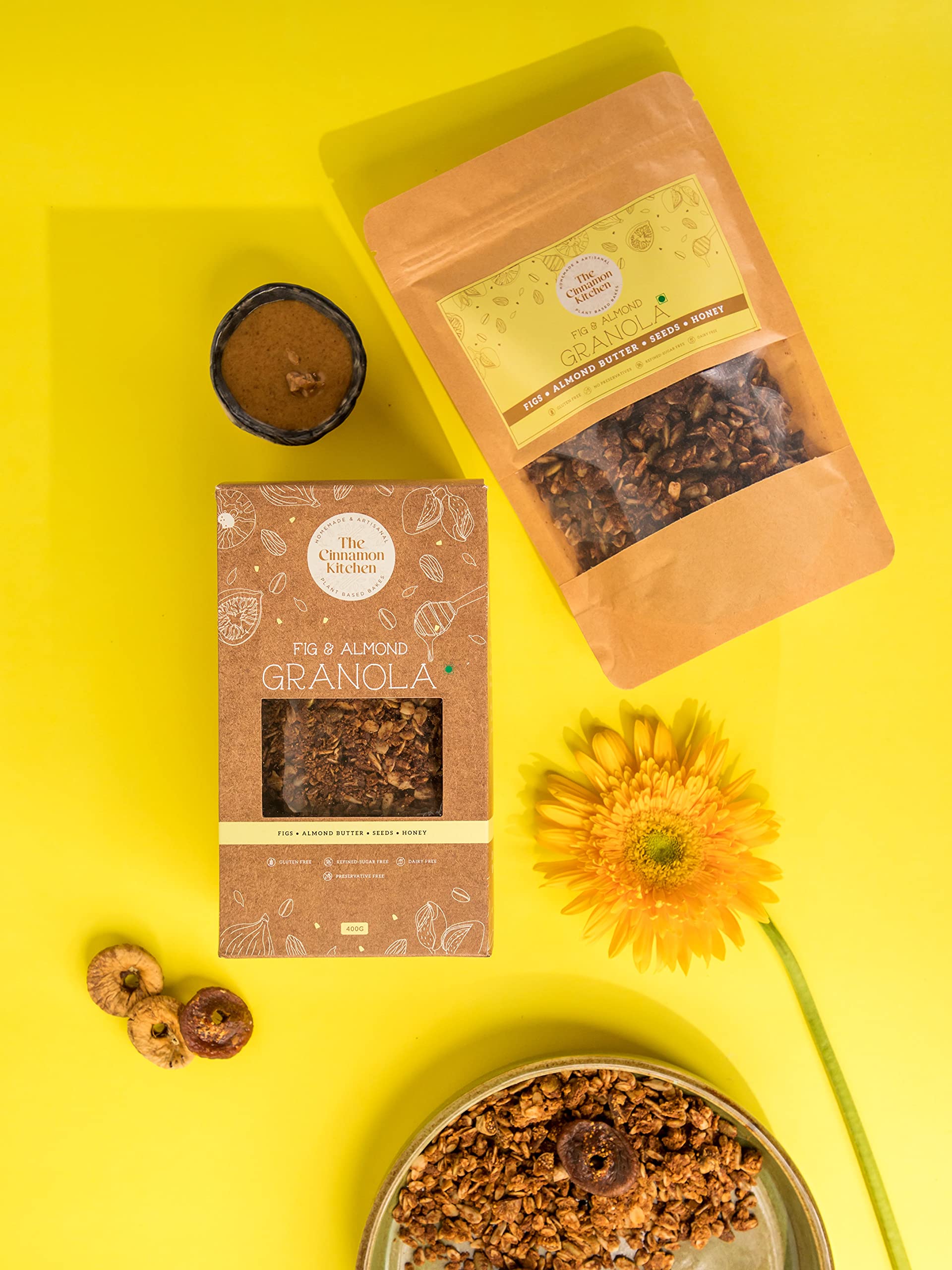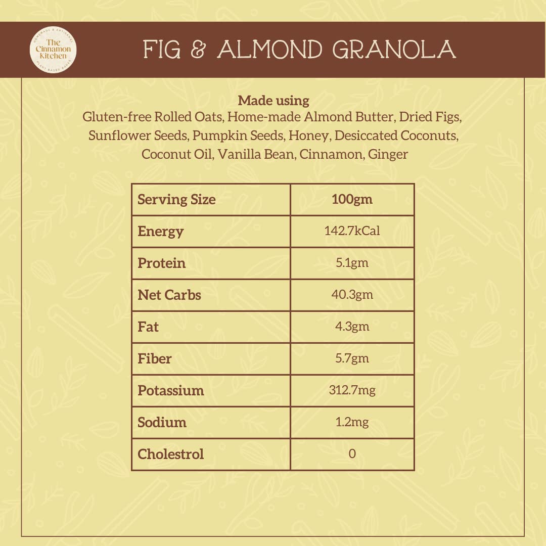 Discover the wholesome goodness of The Cinnamon Kitchen's Fig and Almond Granola where every bite is a symphony of flavors and textures tailored to cater to the health-conscious and those with specific dietary needs. Our 400g pack of granola is a treasure trove of nutrition sweetened naturally with honey to create a delightful experience without the use of refined sugars. It's not just a treat for your taste buds but also a friend to your wellness journey especially for individuals managing PCOS. This gluten-free granola is crafted with the finest ingredients ensuring that you enjoy a high-protein and high-fiber meal that's as delicious as it is nourishing. Each serving is packed with the natural goodness of figs and almonds making it a perfect start to your day or a scrumptious snack on the go. The Cinnamon Kitchen is committed to providing products that complement a healthy lifestyle and our Fig and Almond Granola is a testament to that promise. Indulge in the richness of natural flavors and embrace a guilt-free snacking experience with The Cinnamon Kitchen.