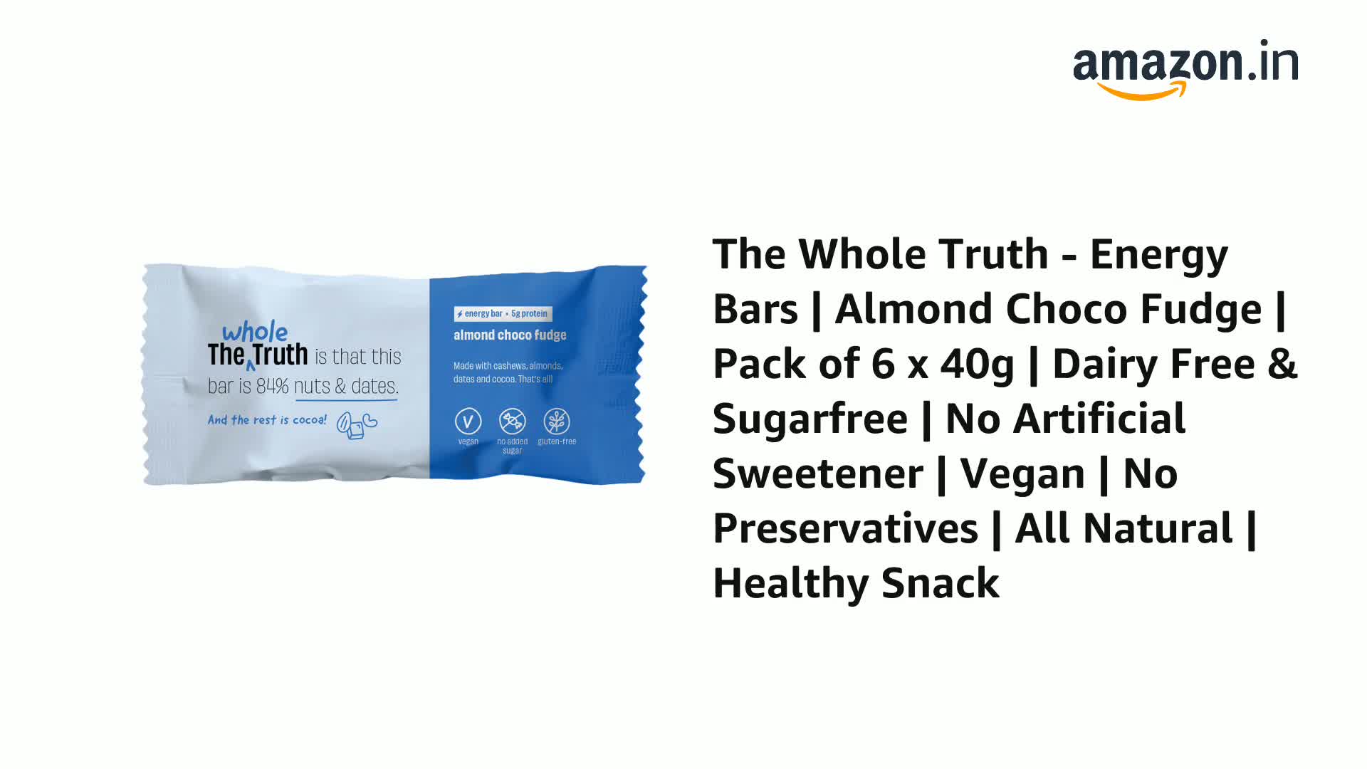 The Whole Truth - Energy Bars | Almond Choco Fudge | Pack of 6 x 40g | Dairy Free & Sugarfree | No Artificial Sweetener | No Preservatives | All Natural | Healthy Snack