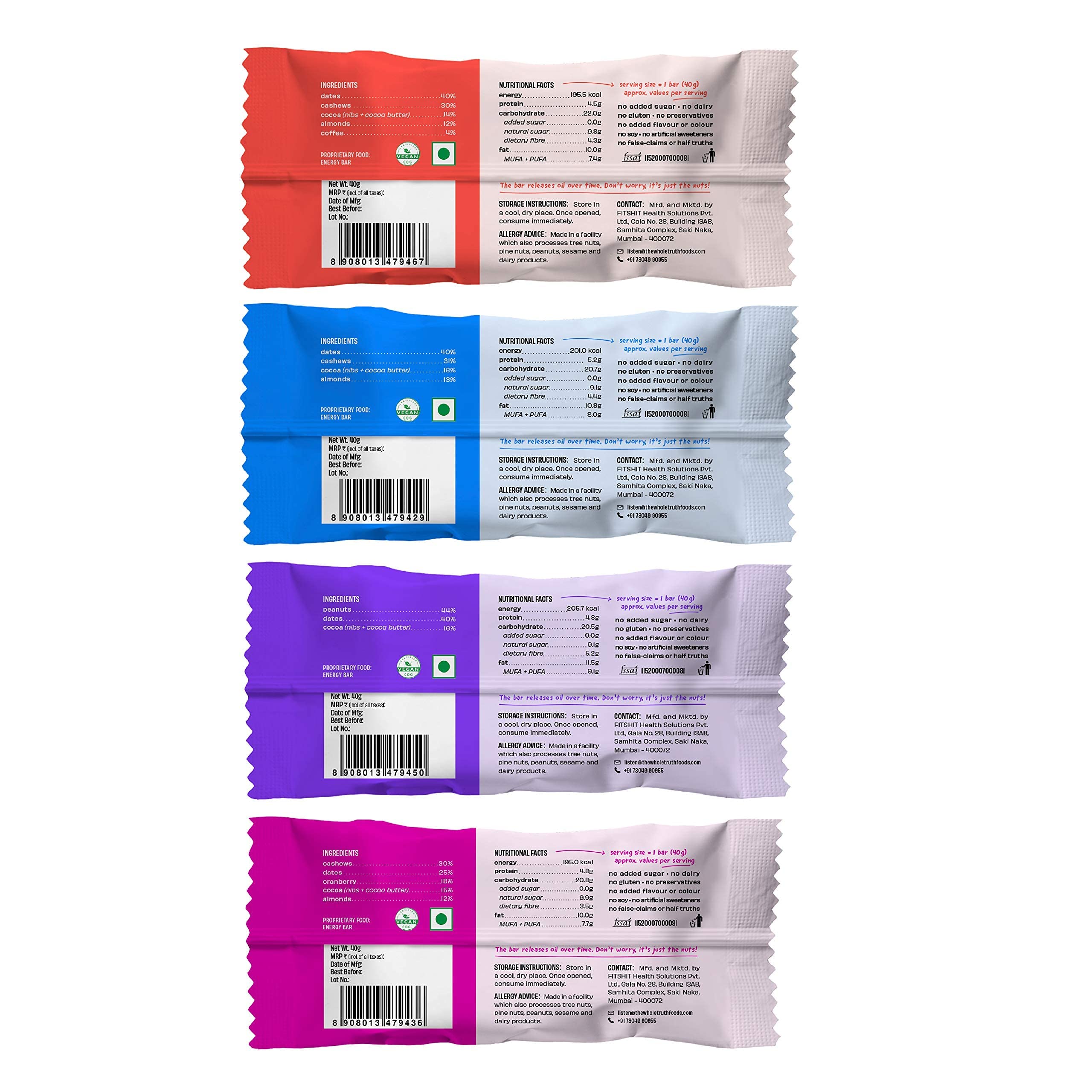 Package Content: 2 bars of Almond Choco Fudge2 bar of Peanut Choco Fudge 1 bar of Cocoa Cranberry Fudge 1 bar of Mocha Almond Fudge; Quantity: 240gm (Each 40g)