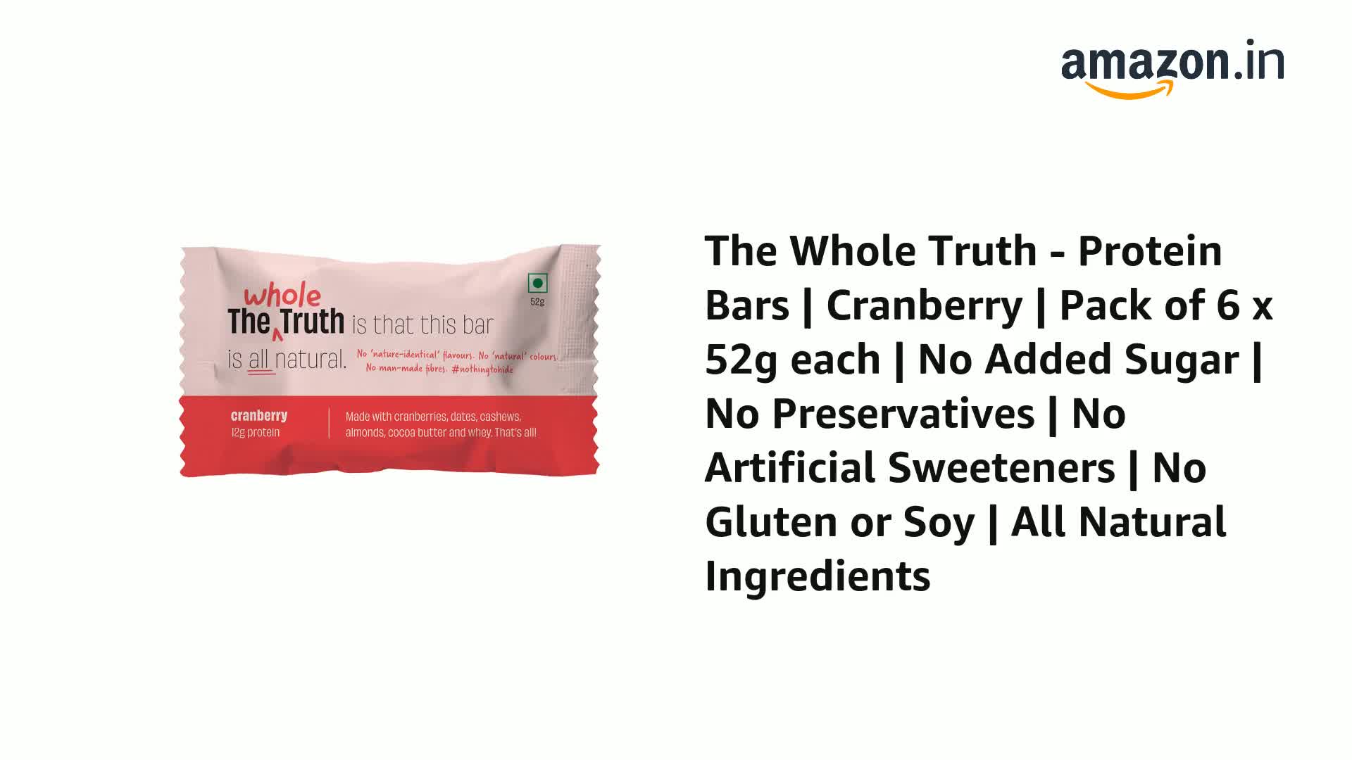 The Whole Truth - Protein Bars | Cranberry | Pack of 6 x 52g each | No Added Sugar | No Preservatives | No Artificial Sweeteners | No Gluten or Soy | All Natural Ingredients