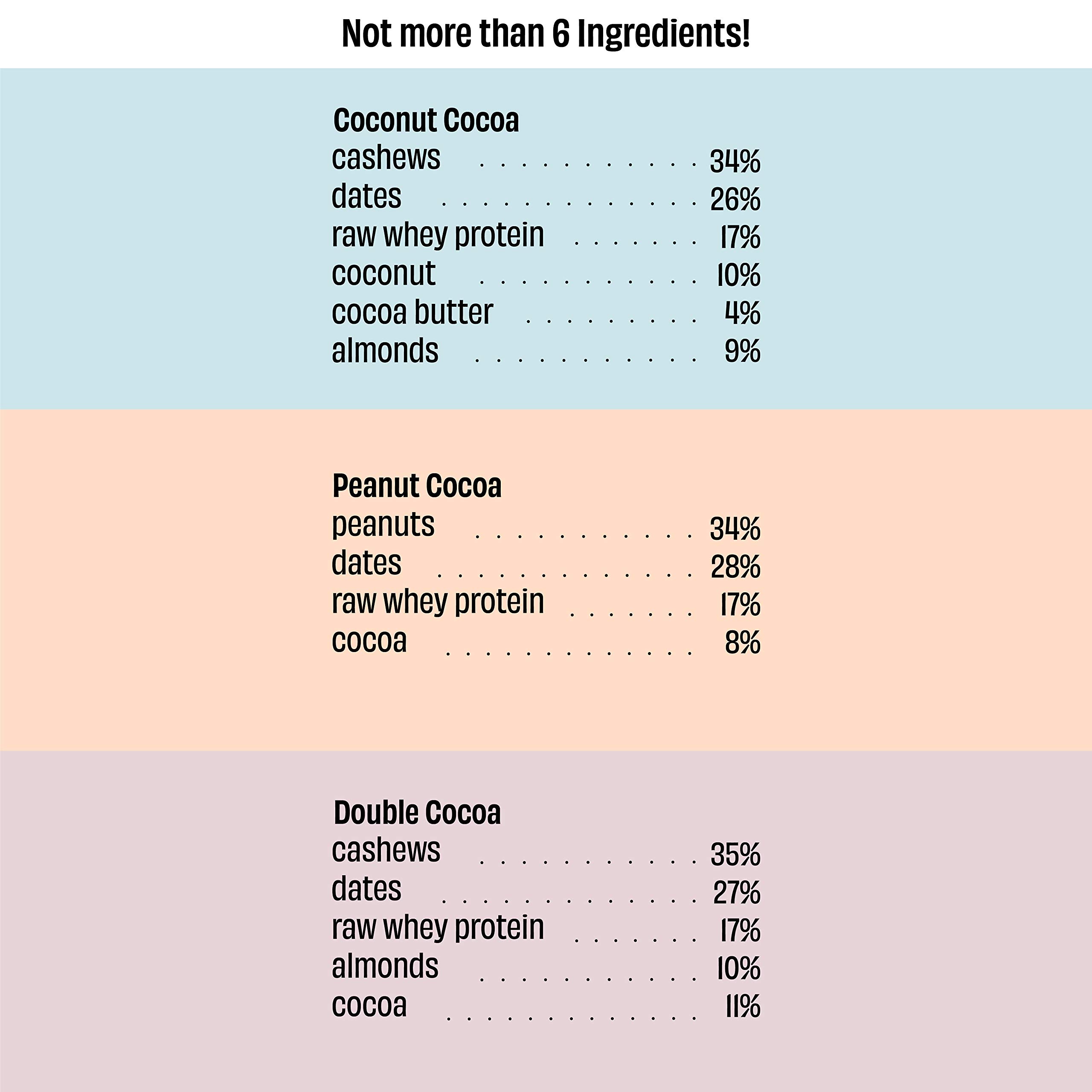 Package Content: 2 Double Cocoa Bars 2 Coconut Cocoa Bars 2 Peanut Cocoa Bars