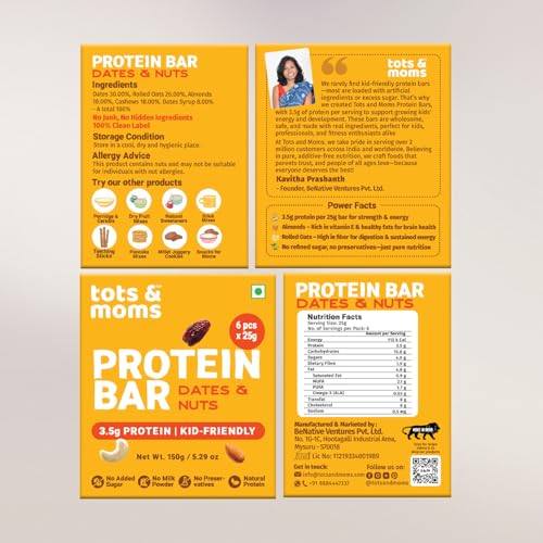 The Protein Bar - Dates & Nuts Bar is a wholesome nutrient-packed snack designed for both kids and adults. Made with simple natural ingredients like dates rolled oats almonds and cashews this bar is a perfect blend of taste and nutrition. It’s free from artificial additives refined sugar and jaggery making it a healthier choice for your little ones and the entire family. With 3.5g of protein per 25g bar it’s a great way to fuel your day or keep your kids energized on the go.