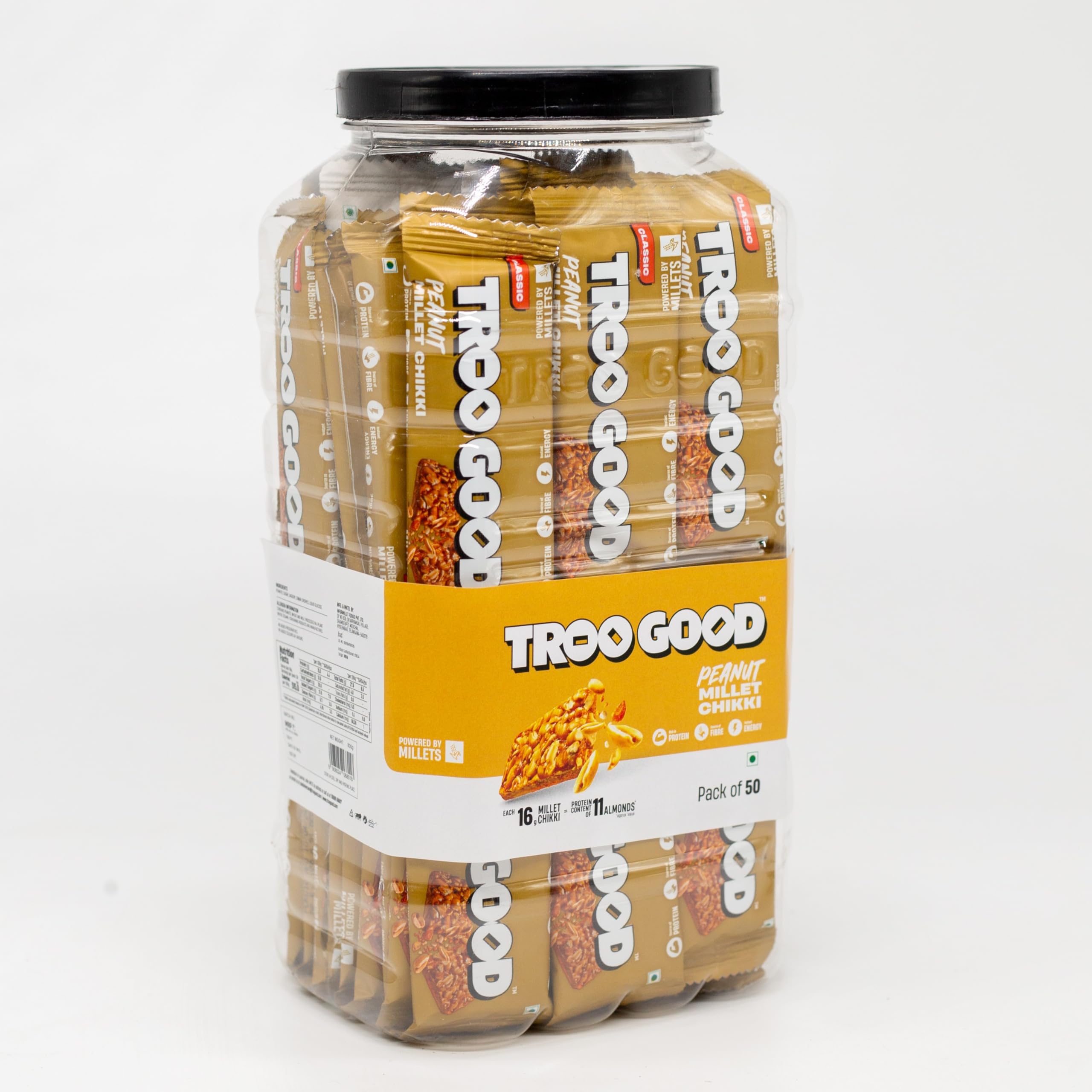 HomeGroceryHealthy BreakfastHealth BarTROOGOOD Peanut Chikki Jar Peanut Millet Chikki No Added Preservatives or Colours | Made with Jaggery | Gajak | | Sweets | Gajak (50Pcs 16g Each 800g)