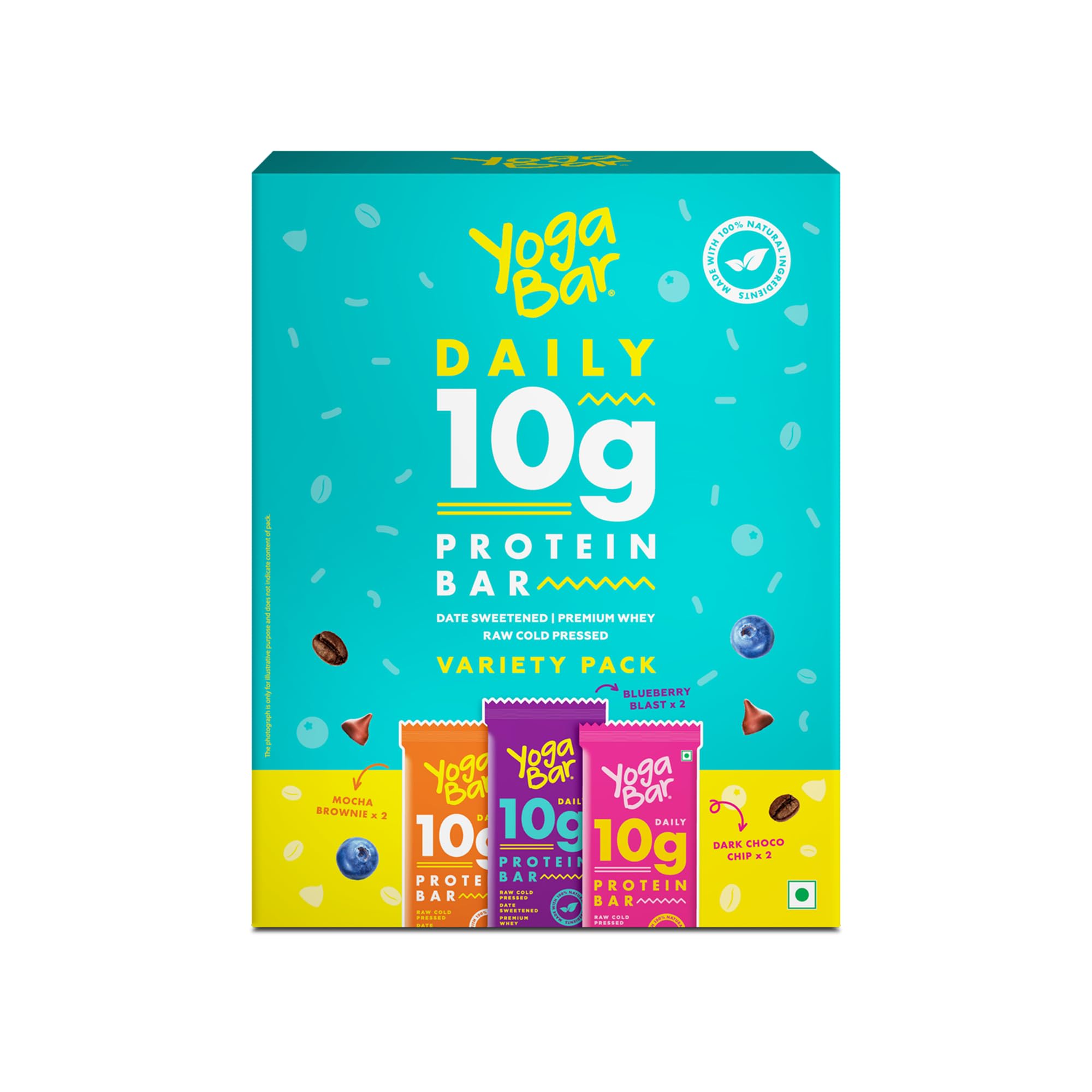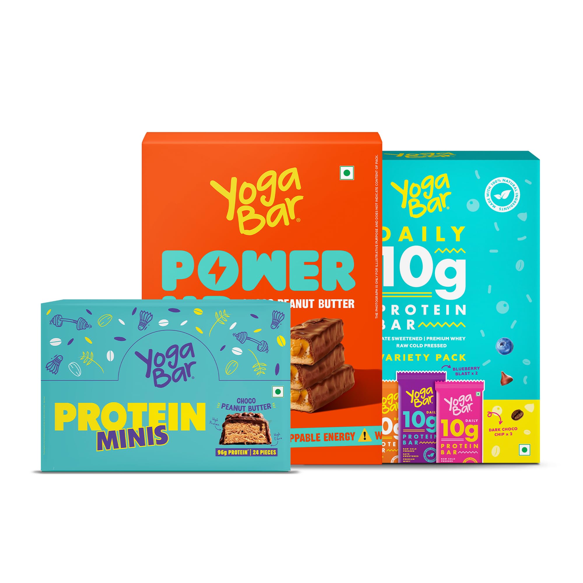 Combo pack of Protein and Fibre Rich bars. Contains a Variety pack of Protein Bars (pack of 6 - 2 Baked Brownie + 2 Cranberry Blast + 1 Almond Fudge + 1 Hazelnut Toffee) and a Variety pack of Snack Bars (pack of 24 - 4g protein mini bars chocolate flavour) and Pack of 5 power up 20g protein bars.