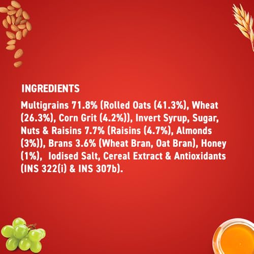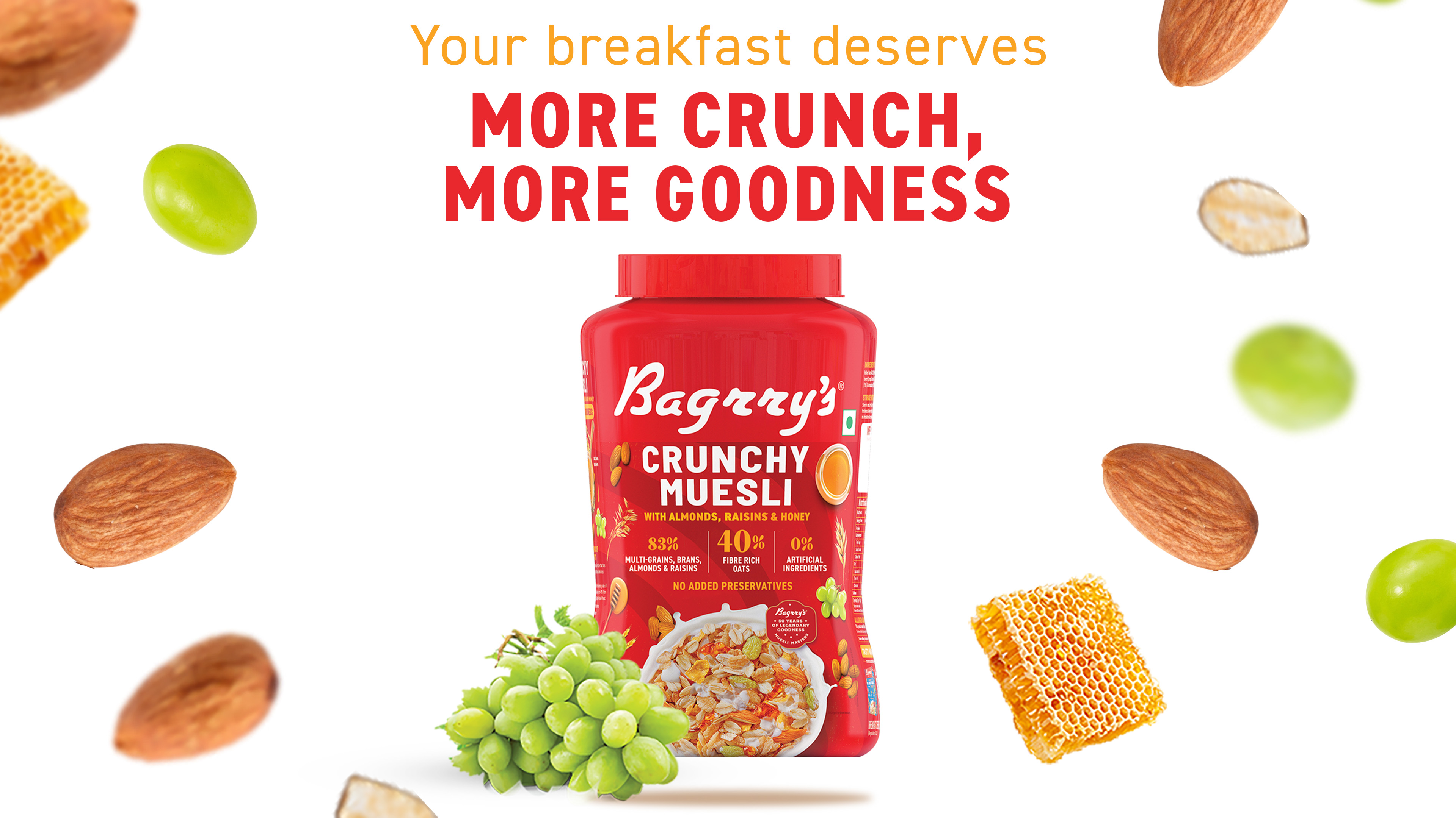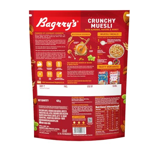 Premium Ingredients: Made with the finest quality ingredients Bagrry's Crunchy Muesli is loaded with goodness of fibre-rich oats and premium inclusions like Californian Almonds Sultana Raisins Raw Honey & Golden Whole Wheat.