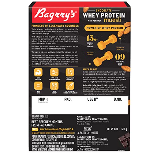 Bagrry's Crunchy Muesli | 40% Fibre Rich Oats with Bran | 82% Multi Grains Almonds Raisins & Honey | Breakfast Cereal | Natural Muesli 1000g JarBagrry's Crunchy Muesli is inspired by the original Swiss muesli recipe! Made with the finest ingredients from across the world such as 100% Imported Whole Oats Californian Almonds Succulent Raisins Natural Honey Crispy Whole Wheat and Golden Corn Flakes along with goodness of added fibre rich Bran. This Multigrain muesli is as delicious as it is nourishing and it's a perfect way to start your day.Bagrry's Whey Protein Muesli |15gm Protein Per Serve |Chocolate Flavour|Whole Oats & Californian Almonds|Breakfast Cereal|Protein Rich|Premium American Whey Muesli 500gm BoxIntroducing a power packed muesli for all fitness enthusiasts with added Imported Whey Protein. A breakfast cereal that is high in protein with the goodness of Imported Oats American Whey and Californian Almonds & Soy Protein isolates. The first of its kind protein product that is high in fibre for easy digestion and is also all natural with no nasty additives.