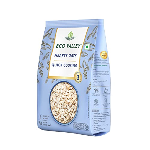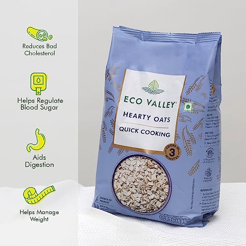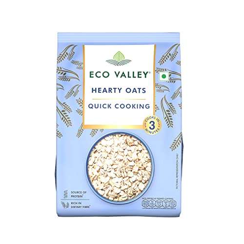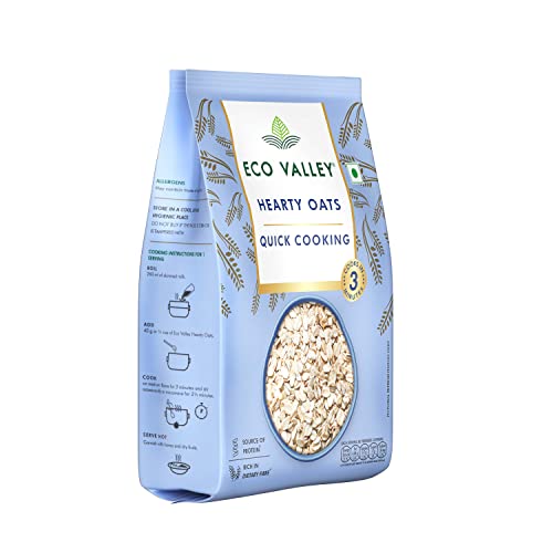 "Kick-start your day with super-satisfying Eco Valley Hearty Oats - a convenient and healthy alternative to your regular breakfast! This is an ideal breakfast choice for those who have made health and fitness their priority. These 100% natural rolled oats are a perfect blend of health and taste. Since these oats can be prepared in just 3 minutes you won't have any reason to skip your breakfast. Rich in dietary fiber and protein these oats have a rich array of health benefits. An easy-to- cook cereal Eco Valley Hearty Oats are good for your lifestyle in more ways that you can imagine. One can cook multiple delicious recipes with these oats or include them in smoothies. Minimal effort and time are required to prepare these healthy and delicious oats. Serve it hot with milk juices honey fresh and dried fruits and relish the goodness of oats and an amazing taste at the same time. Can also be used as a staple ingredient in your everyday meals. Being gluten free and without any added sugar these oats also help in managing cholesterol"