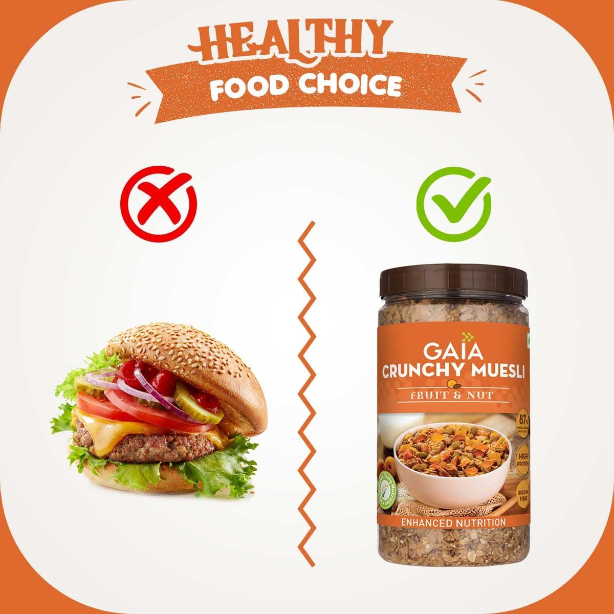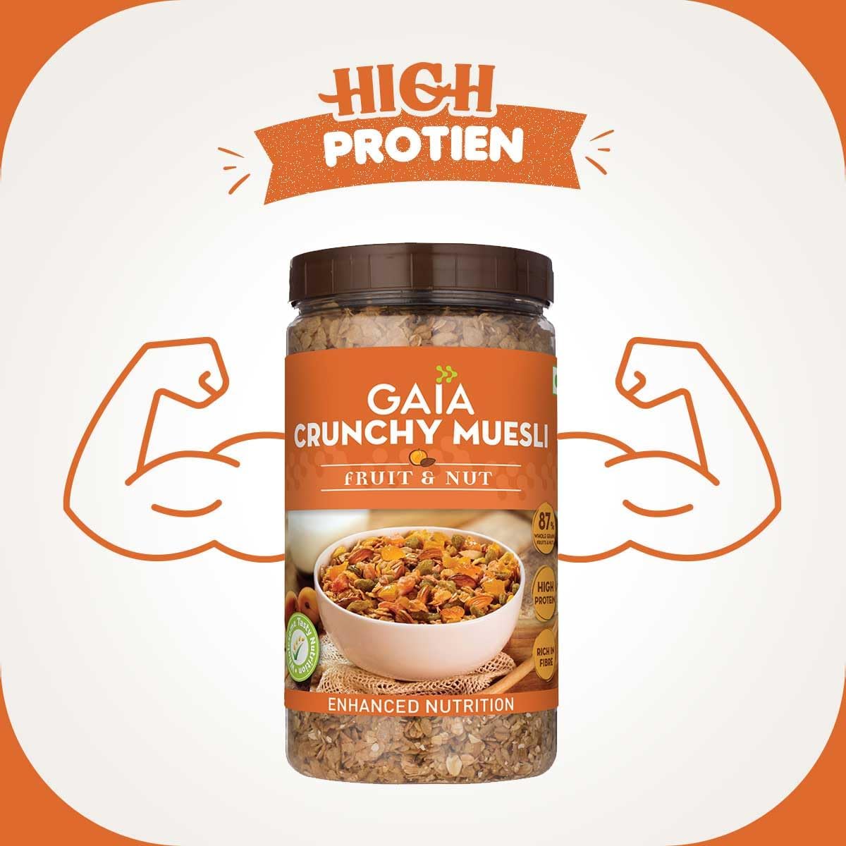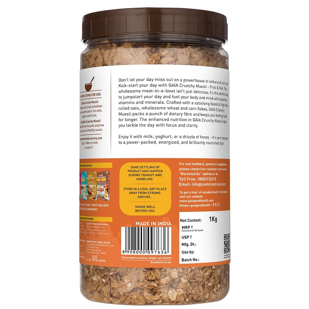 Gaia Crunchy Muesli Fruit and Nuts a Mix of Wholesome Breakfast Cereals Packed with Fibre Iron and Antioxidants Serves As the Nourishing Tasty Breakfast Option. 1KG Jar Pack