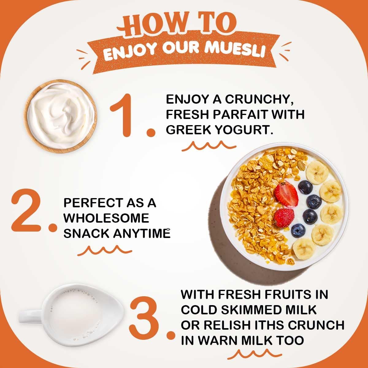 HomeGroceryHealthy BreakfastOats & MuesliGaia Crunchy Muesli Fruit and Nuts a Mix of Wholesome Breakfast Cereals Packed with Fibre Iron and Antioxidants Serves As the Nourishing Tasty Breakfast Option. 1KG Jar Pack