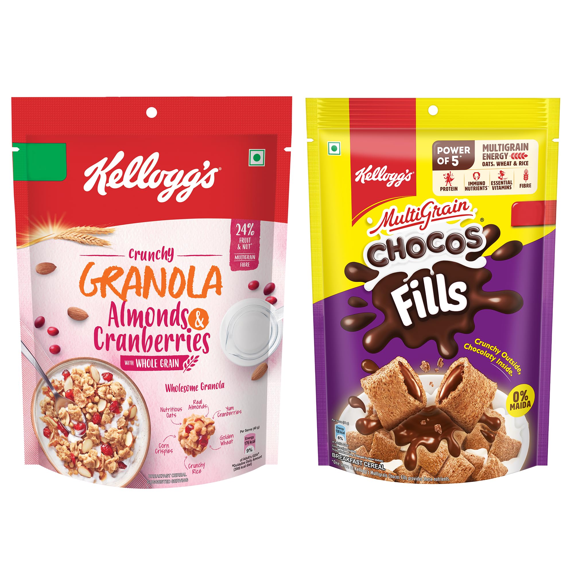 Kellogg's Chocos Fills Double Chocolaty - Filled pillows which are crunchy chocolaty outside and chocolaty inside. It is an anytime anywhere snack. Experience yummy taste of kelloggs chocos fills during breakfast between lectures while travelling or late - night munching. Kellogg's Granola ALmonds & Cranberries - Enjoy baked multigrain clusters of whole-grain oats wheat corn rice and barley generously loaded with real almonds and cranberries.