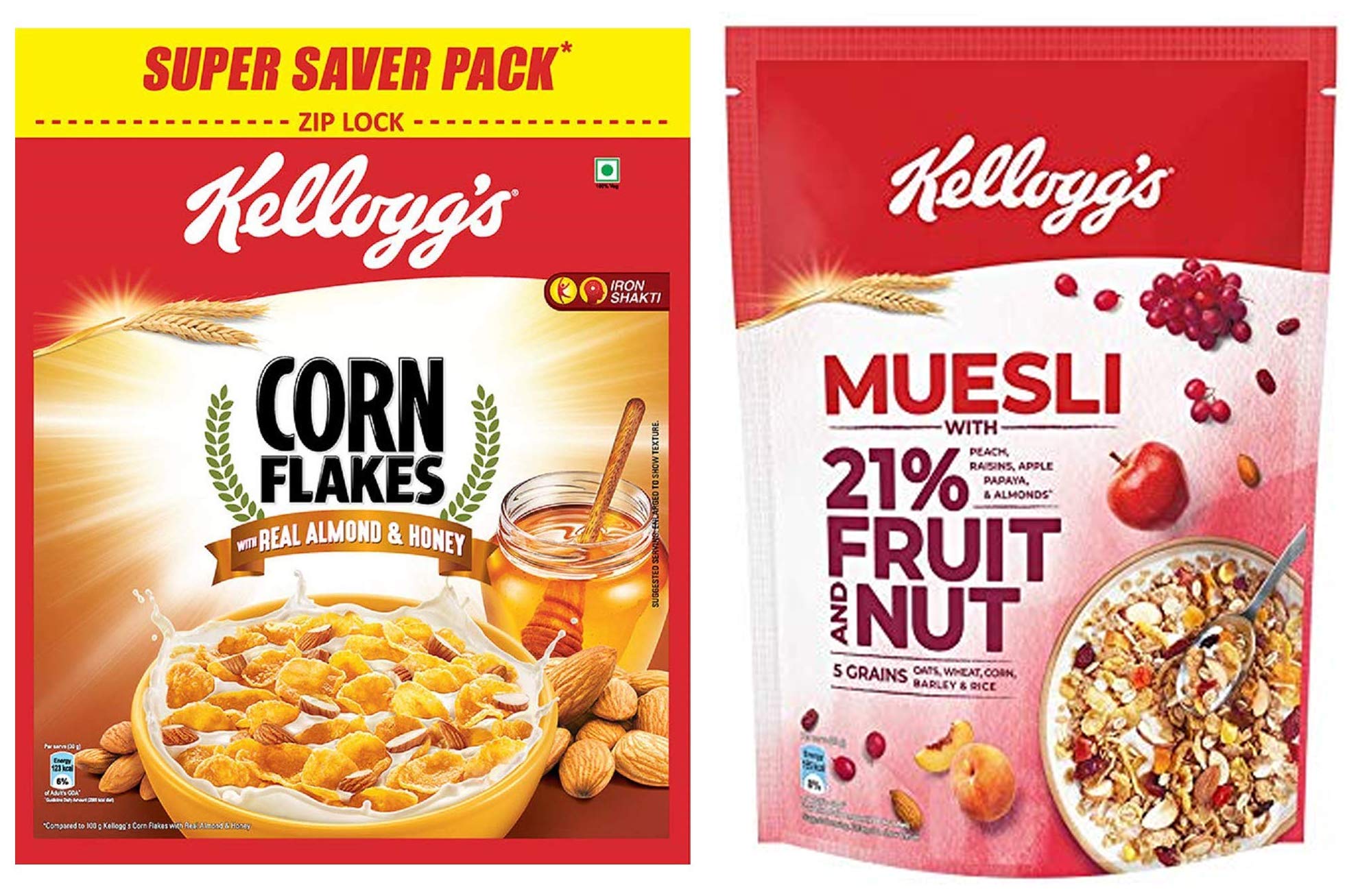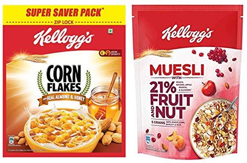 Kellogg's Corn Flakes Real Almond and Honey 1 kgKellogg's Corn Flakes Real Almond and Honey 1 kgKellogg's Muesli with 21% Fruit and Nut Pouch 750 gKellogg's muesli fruit & nut with the goodness of 5 baked grains and an abundance of dried fruits and nuts is carefully crafted for flavour and texture. Say hello to a delightful breakfast filled with multigrain goodness that will jump-start your mornings and get you ready for the day. Its beauty lies in its simplicity - just take a handful of Kellogg's muesli and feel nature's bounty in its grainy nutty fruity goodness!.