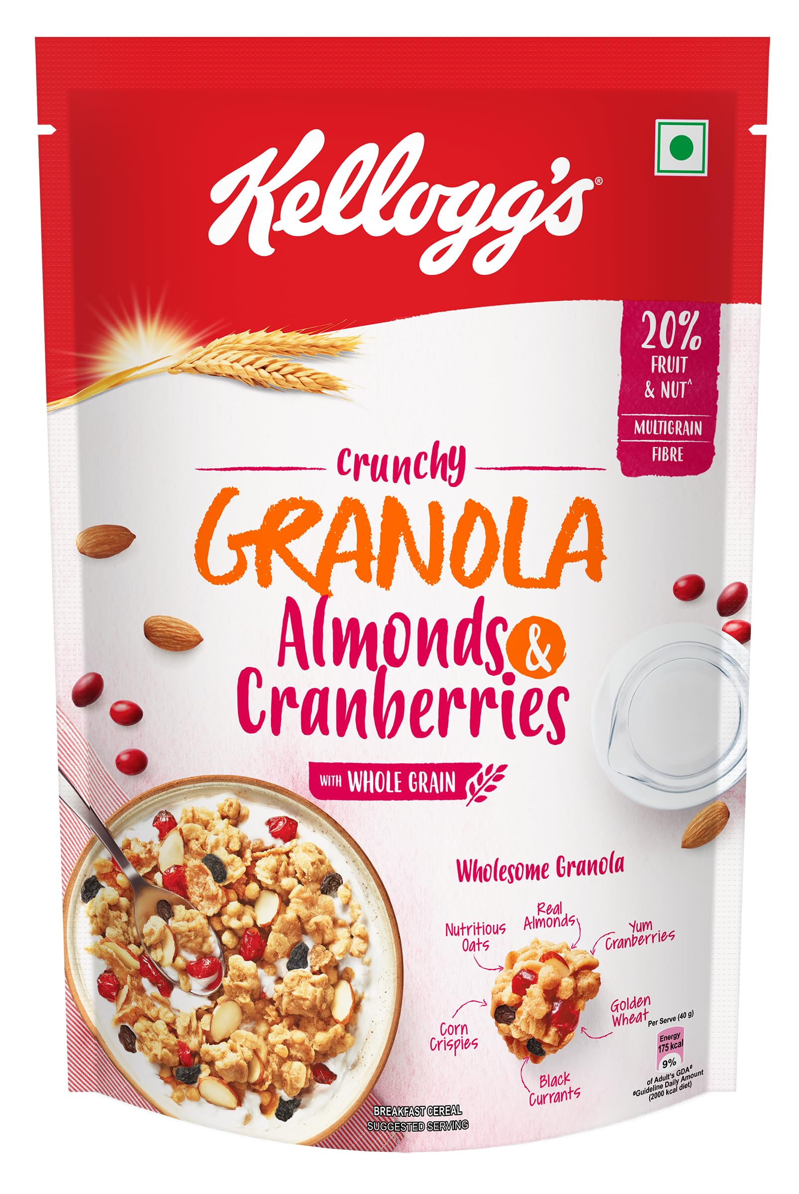 Baked Goodness - Kellogg's Crunchy Granola is toasty oven-baked creation carefully crafted for flavor and texture. Your taste-buds will love our perfectly baked multigrain clusters that are generously loaded with 24% real almonds & yum cranberries.